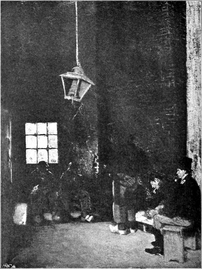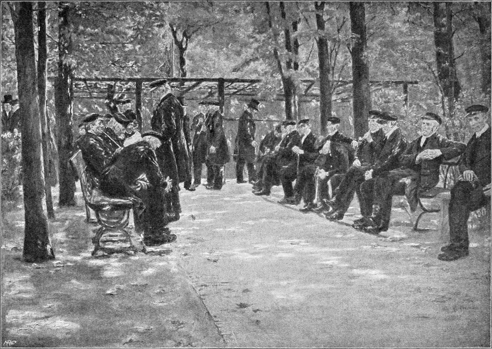 In den „Konservenmacherinnen“ und in den „Invaliden im Lotsenhaus“ beginnt sich der schwärzliche Ton der Liebermannschen Bilder schon aufzulichten. Statt Beinschwarz verwendet der Künstler Asphalt, auf dessen durchsichtigem Braun die Farben anfänglich warm und leuchtend stehen, um allerdings später durch die zersetzende Kraft des Bitumens stumpfer zu werden. Nach der psychologischen Seite ist ein außerordentlicher Fortschritt zu konstatieren. Die „Konservenmacherinnen“ (Abb. 3) — derbe, kräftige Weiber, abgerackerte Arbeitsfrauen und wunschlos gewordene alte Mütterchen — sitzen auf hölzernen Bänken und Fässern in einem dunklen, niedrigen Arbeitsraume an einem improvisierten Tische und putzen mit kurzen Messern die verschiedenartigsten Gemüse. Kein Blick aus all’ den Augen fällt auf den Beschauer. Keine der Arbeiterinnen hat eine Empfindung davon, daß eines Malers Auge auf ihr geruht. Die unendliche Natürlichkeit in dem still vor sich Hinbrüten der Einen, die bewegliche Geschäftigkeit der Anderen, der unbewußte Ausdruck der zwölf oder dreizehn Gesichter gibt der Darstellung den wunderbarsten Reiz. Unwillkürlich gerät man in Versuchung, Charakterstudien zu[S. 22] machen, und ist erstaunt, welche Fülle von Individualitäten der Künstler in diesem einen Bilde gibt. Freilich muß man lesen können in Menschengesichtern, wird dann aber von diesem Bilde die Überzeugung mitnehmen, daß sein Urheber den Menschen, die er dargestellt, bis ins Herz gesehen hat. Dieselbe vollendete Natürlichkeit zeigen die „Invaliden im Lotsenhause“ (Abb. 5). Dieses ruhige Herumsitzen in dem hohen verräucherten Raume um den qualmenden Kamin, halb nachdenklich, halb gedankenlos, entspricht auf das Vollkommenste dem Wesen der Männer, die gewohnt sind, wortlos ihre Pflicht zu thun. Auch hier wieder wirkliche Menschen, nicht bloße Typen, und das Rot in den Hemden der bedächtig ihre Thonpfeife rauchenden Seeleute mit ihren sonderbaren hohen Hüten von feinster malerischer Wirkung zwischen Schwarz und Braun.