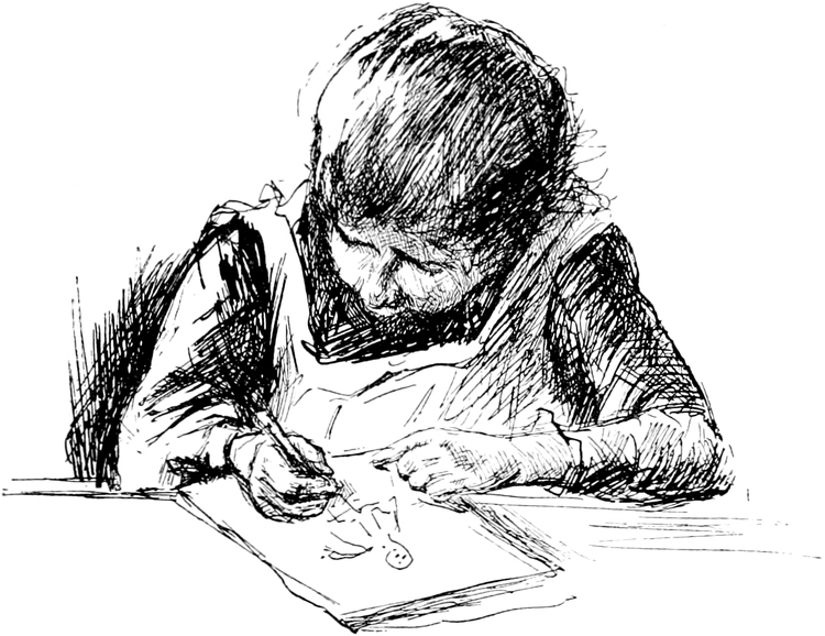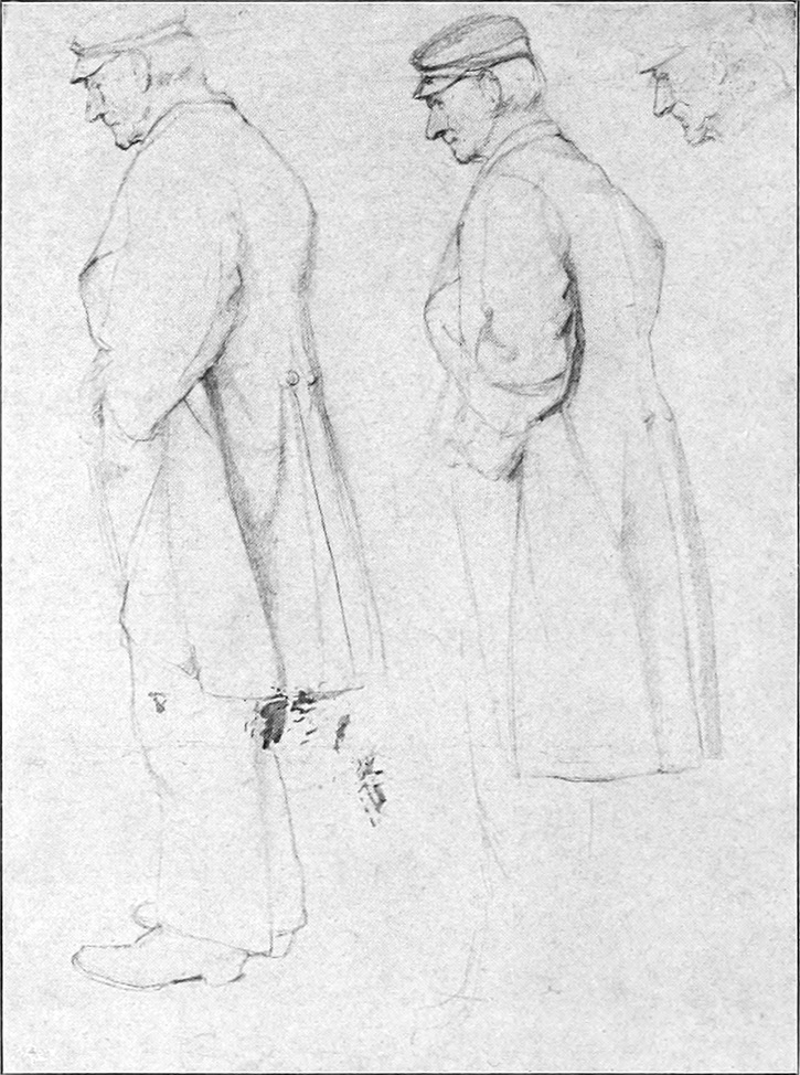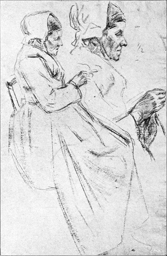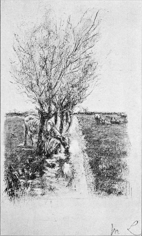 Von diesem Standpunkt aus muß man, um das richtige Verhältnis zu ihnen zu gewinnen, den Studien, Skizzen und Zeichnungen Liebermanns gegenüber treten. Sie sind niemals fertig in dem gewöhnlichen Sinne, fast immer aber fertig in jenem höheren, und darum nicht selten ganz hervorragende Kunstwerke. In Liebermanns Kunst drängt alles ungestüm nach Charakter. Für ihn gewinnen jedoch viele Erscheinungen erst Charakter durch Bewegung, und er hat eine unglaubliche Gewandtheit darin erlangt, Bewegungen zu beobachten und wiederzugeben. Von seinem „Mann mit der Kuh“ (Abb. 85) sieht man eben nicht mehr, als den Rücken; aber auch wenn dieser nicht gebeugt wäre, würde man aus der Art, wie der Mann geht, den Schluß ziehen müssen, daß er alt ist. Die Kuh schnuppert nicht nur am Grase, sie frißt; man kann gar nicht daran zweifeln. Wie ausgezeichnet beobachtet ist die Bewegung des Jungen, von dessen[S. 55] Ziegen die eine vor-, die andere rückwärts will (Abb. 54)! Die Studien zu den „Spitzenklöpplerinnen“ (Abb. 19) und den „Netzeflickerinnen“ (Abb. 48), zum „Schulgang“ (Abb. 94), zu dem seine Sense dengelnden Bauer (Abb. 60), zum „Schuster“ (Abb. 21) und viele andere sind daraufhin anzusehen. Liebermann hat viele neue Bewegungsmotive in die Kunst gebracht. Aber neben seiner außerordentlichen Fähigkeit, mit einem Nichts von Mitteln zahlreiche Vorstellungen anzuregen, wofür in besonderem Maße u. a. seine kleinen Landschaftszeichnungen zeugen, treten noch zwei andere Eigenschaften bei seinen Studien und Zeichnungen hervor, die ihn zu einer eigenartigen Erscheinung machen: die malerische Empfindung und das sichere Gefühl für Raumwirkung. Sollte man nicht glauben, daß einige der hier fast in Originalgröße wiedergegebenen Blätter aus Liebermanns kleinem Taschenskizzenbuch, wie „Kanal in Leyden“ (Abb. 105), „Kirmes in Laren“ (Abb. 109), „Schulgang“ (Abb. 94) Reproduktionen nach farbigen Originalen wären? Vermißt man Farbe bei der Kohlenskizze der sich die Hände wärmenden Frau (Abb. 42), bei der Kreidezeichnung „Nach Hause“ (Abb. 110), bei der Federzeichnung „In den Dünen“ (Abb. 106)? Alle diese Blätter geben, obwohl sie nur Zeichnungen, also schwarz und weiß sind, doch ganz vollkommene Vorstellungen von den Farbenwerten (valeurs), die der Künstler in der Natur fand. Natürlich kann man, wo es sich nicht um ein für allemal feststehende Thatsachen, wie, daß Bäume grün, ein bewölkter Himmel grau, ein Kornfeld gelb sind, handelt, über eine einzelne Farbe im Unklaren sein, aber man ist niemals im Zweifel über das Verhältnis der Farben zu einander, die Liebermann vor Augen hatte. Und das ist es, worauf es ankommt. Zur Erreichung malerischer[S. 56] Wirkungen gehört aber noch ein anderes: die Berücksichtigung der Lichtverhältnisse, im Grunde also auch eine Darstellung von Bewegungen, aber nicht am Individuum, sondern am Größeren, an der Natur. Hierin ist Liebermann ein Meister ersten Ranges, und nur wenn es sich um Spezialbeobachtungen handelt, wie etwa bei den Studienzeichnungen zum „Altmännerhaus“ (Abb. 15) oder zu den „Konservenmacherinnen“ (Abb. 12) sieht er von einer Wiedergabe luminaristischer Zustände ab. Welche bedeutsame Rolle spielt das Licht bei dem schon erwähnten „Schulgang“ (Abb. 94), dem „Mann mit der Kuh“, dem „Lesenden Mädchen“ (Abb. 66), bei dem Blatt „In der Sommerfrische“ (Abb. 98), bei der „Porträtstudie“ (Abb. 90), bei der Zeichnung des Kindes in der Wiege (Abb. 57)! —