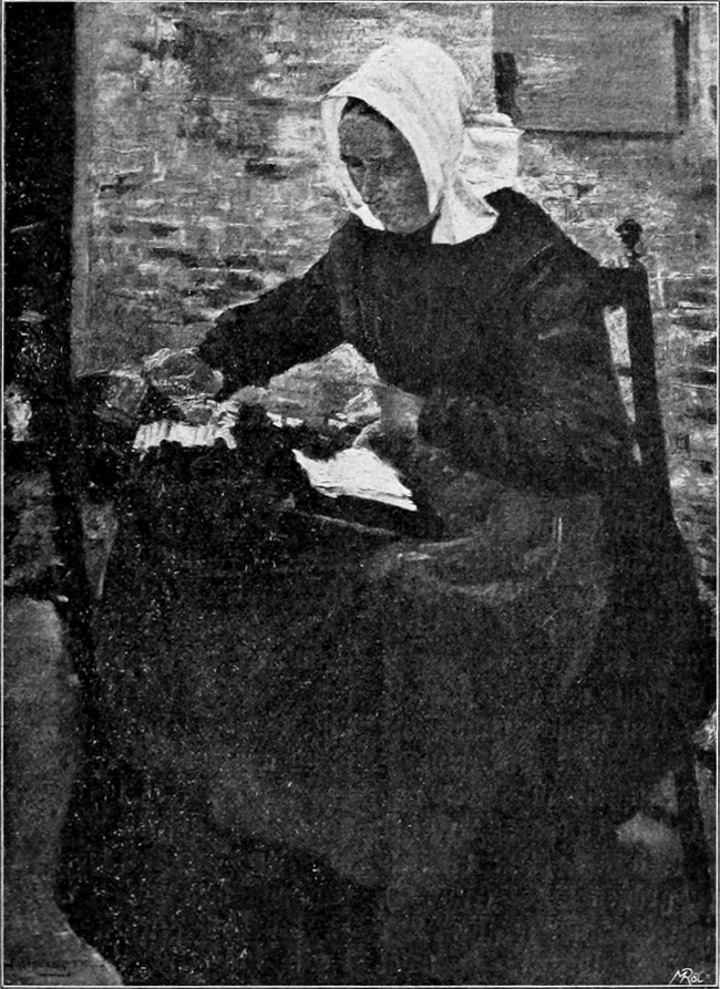 Vor sich selbst und seinen Freunden glich Liebermann diesen Mißerfolg bei dem großen Publikum mit einem Bilde aus, das zu seinen kostbarsten Schöpfungen gehört, mit nichts auf der Welt, als mit sich selbst, verglichen werden kann und den jungen Künstler im Auslande als den bedeutendsten Vertreter der deutschen Kunst erscheinen ließ, mit dem „Altmännerhaus in Amsterdam“ (Abb. 14). Mag auch das Prinzip Millets: „Mettre l’homme vrai dans son milieu vrai“ bei der Wahl des Stoffes mitbestimmend gewirkt haben — Millet hätte dieses Bild schwerlich gemalt, schwerlich malen können, und ebensowenig würde Menzel imstande gewesen sein, eine an sich so wenig äußerliches Interesse bietende Wirklichkeit künstlerisch so interessant zu gestalten. In dem „Altmännerhaus“ künden sich ferner neue luminaristische Bestrebungen an, die für Liebermanns künftiges Schaffen von besonderer Bedeutung werden. Man sieht in den hinten von einem Laubengange abgeschlossenen Garten des „Oude Mannenhuis“. In einer schattigen Allee sind zu beiden Seiten Bänke aufgestellt, auf denen sitzend die Insassen des Hauses den schönen Tag genießen. Alte würdige Herren, denen die schwarze Kleidung und die weiße Binde den Anschein des Wohlgestelltseins gibt. Die Anstaltsmütze auf den greisen Köpfen sitzen sie bei einander, brüten vor sich hin, rauchen mit Behagen ihre langen Pfeifen, reden mit dem Nachbar, lesen Zeitung oder lassen sich von der Sonne bescheinen. Ein paar von ihnen stehen, andere schreiten in dem Laubengange auf und nieder. Über den Platanen und Kastanien des Gartens steht leuchtend die warme Sonne und sendet ihre goldenen Strahlen durch das grüne Laubdach. Lustig hüpfen sie über die alten Gesichter, die welken Hände, die schwarzen Röcke der Männer, über den sauberen Kiesweg zu ihren Füßen. Wie eine Stätte des Friedens, wohin der Lärm des Lebens, seine Sorgen und Enttäuschungen nicht mehr dringen, liegt der Garten da. Die auf den Bänken haben abgeschlossen mit dem Dasein; aber der milde Sommertag thut ihnen wohl, und seine goldene Sonne zaubert den Schein des Glückes um ihre greisen Häupter. Ein prächtiges, versöhnliches Bild. Von ähnlicher innerlicher und äußerlicher Schönheit ist die „Alte Frau am Fenster“ (Abb. 16),[S. 28] die so ganz in das Stopfen ihrer Strümpfe vertieft ist, daß sie den hellen sonnigen Frühlingstag vor dem kleinen Fenster ihres armseligen Zimmerchens nicht sieht. Sanft gleitet das Tageslicht über ihre große weiße Haube, das von tausend Fältchen durchzogene Gesicht und die alten steifen Hände. Man bemerkt schon, daß sie eine arme Frau ist, aber Niemand wird verleitet, sie für besonders bedauernswert zu halten. Sie ist weder mit den Augen eines Mitleidigen, noch mit denen eines Spötters gesehen. Das ist das Leben, das Schwerste und das Selbstverständlichste in einer Erscheinung. Anstatt unser Gefühl für die bedürftige Armut anzurufen, läßt Liebermann sie arbeiten und zeigt, wie selbst in der traurigsten Hütte die Natur für den, der sehen kann, tausend Schönheiten ausbreitet. Seit Pieter de Hooch ist ein holländisches Interieur nicht feiner gemalt worden, wenigstens nicht mit mehr Empfindung für den Zauber des Lichtes im Raume. Ohne einem alten Meister nachzugehen, erreicht Liebermann hier dasselbe, wie jener, durch die sorgfältige Beobachtung der Natur, und was wichtiger ist, ihrer malerischen Zustände. Nichts von Übernommenem in diesem Bilde, jeder Pinselstrich die Niederschrift eines Erlebnisses vor der Natur.