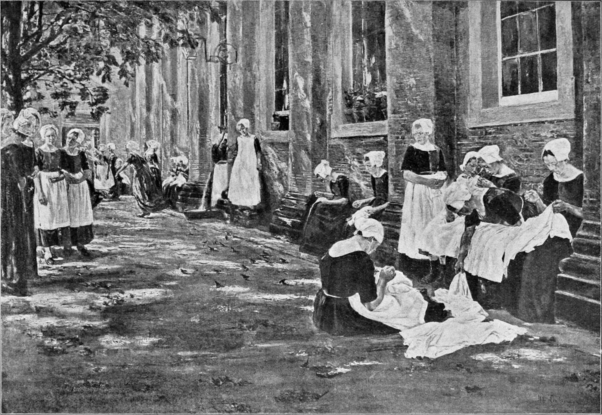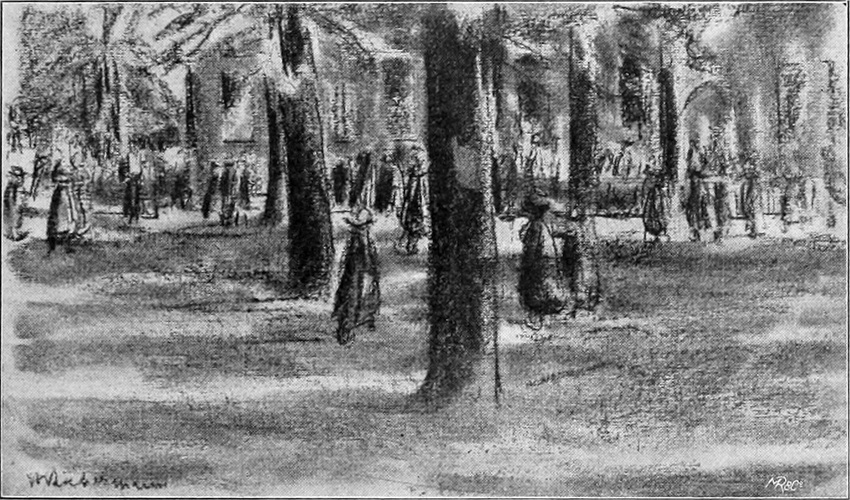 Weder in den „Gänserupferinnen“, noch in den „Konservenmacherinnen“ ist die Komposition sehr originell zu nennen, obschon sie zwanglos erscheint. Bei den „Arbeitern im Rübenfelde“ macht sich die Absicht, von der Schablone loszukommen, angenehmer bemerkbar als die Art, wie es geschieht. Es ist kein rechter Zusammenhang da. Die Unterordnung der Figuren unter die Landschaft gibt eine etwas gewaltsame Ge[S. 80]schlossenheit. Um so glücklicher ist die Abwendung von den Regeln der Schule im „Altmännerhaus“. Man kann wirklich nicht leicht ein paar Dutzend Menschen besser in einem Bilde verteilen, ohne sie einzeln wirken und dabei doch den Raum so außerordentlich stark mitsprechen zu lassen, wie es auf Liebermanns Bild der Fall ist. Die stark in Verkürzung gesehene Bank links mit den Männern daraus wird aufs unauffälligste durch den vor dem Zeitungsleser stehenden Alten, die hinten im Gange stehende Gruppe und den im Laubengang Promenierenden mit der Bank rechts und den darauf Sitzenden in Verbindung gebracht. Wie mächtig und schließlich doch wie unauffällig wirkt der fast die Hälfte des Bildes einnehmende Erdboden mit den leisen Sonnenflecken als Stimmungsfaktor! Er ist es, der den Eindruck der Abgeschiedenheit vom Leben, des einsamen Ausruhens, den die Gestalten der alten Männer mit ihren schwarzen Röcken und weißen Halsbinden erwecken, verstärkt. Der „Hof des Waisenmädchenhauses in[S. 81] Amsterdam“ hat scheinbar eine gewisse Ähnlichkeit in der Komposition mit jenem Bilde, besonders durch die mit Gestalten besetzte Diagonale, die die Fläche des Bildes von rechts unten nach links oben schneidet; aber im Grunde ist doch alles anders. Beim „Altmännerhaus“ schritt der Beschauer gewissermaßen auf die Bank links zu, hier würde er geradeswegs auf die Pforte im Hintergrunde stoßen. Das soll aber nicht sein, und so wird sein Blick gefangen genommen durch die Gruppe der jungen Näherinnen rechts im Vordergrunde. Um die Diagonale im Bilde zu unterbrechen und zu verdecken und zugleich, um die das Auge auf sich ziehende Masse des Weiß zu vermehren, sitzt das eine Mädchen mit seiner Näharbeit vor den übrigen an der Erde. Die Gruppe erscheint in kühler Beleuchtung und bildet dadurch einen wirksamen Gegensatz zu dem Sonnengeflimmer im übrigen Bilde, was aber wieder durch die reichliche Verwendung von Weiß unauffällig geschieht. Das Weiß von vorn klingt dann an den verschiedenen Gestalten des Mittelgrundes in Schürzen und Hauben aus und findet schließlich Abschluß in den sonnenbeglänzten Figuren im Hintergrunde.