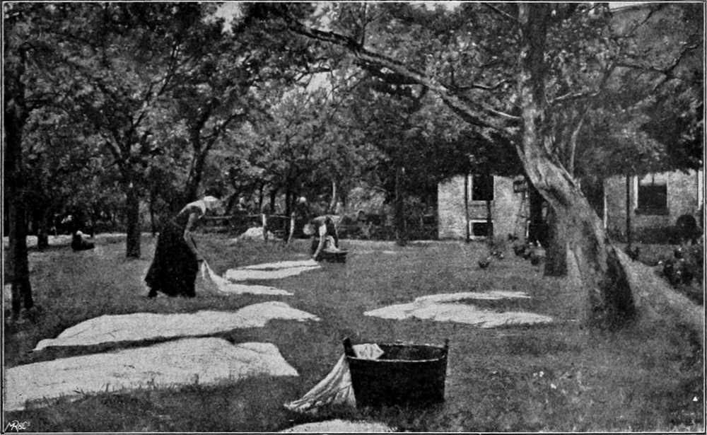 Leben und Bewegung darzustellen, das ist es, worin Liebermann die Aufgabe seiner Kunst sieht. Als er begann, war es die materiellste aller Bewegungen, die ihn anzog, die Arbeit. Er hat Gänserupferinnen, Konservenmacherinnen, Feldarbeiter, Weber, Seiler, Kartoffelgräber, Netzeflickerinnen, Schuster, Klöpplerinnen, Näherinnen u. s. w. gemalt. Dann kamen einfachere Bewegungen: Gehen, laufen, tragen, wiegen, spielen, Vieh hüten, reiten, fahren und endlich die immateriellen Bewegungen: das Wehen der Luft, das Eilen des Lichtes. Auf Liebermanns Bildern geschieht nichts, sie wollen nicht mit dem Verstande betrachtet, sie wollen gesehen sein. Was ist daran, wenn sieben junge und wenig hübsche Holländerinnen (Abb. 51) in weißen Hauben, dunklen Kleidern und blauen Schürzen vor dem Hause auf einer Bank sitzen und nähen, die eine an einem großen Stück Linnen, die anderen an Tüchern und dergleichen? Gar nichts, wenn nicht ein geschmackvolles Stück Malerei gezeigt würde, wenn man nicht die verschiedenen Arten, ein und dieselbe Arbeit zu verrichten, an ihnen beobachten könnte. Mag das Bild auch den allgemeinen Vorstellungen von „fertig“ nicht entsprechen, Eins ist bis ins Letzte vollkommen gegeben: die Bewegung des Arbeitens. Kein anderer Künstler hat sie intimer dargestellt. Ein anderer würde[S. 88] vielleicht Mühe darauf verwendet haben, die Gesichter mit den gesenkten Augen, die Hände mit den flinken Fingern recht ausführlich zu malen; Liebermann fand einer ganz genauen Darstellung nur wert, wie die Mädchen sich beim Arbeiten halten, welche Bewegungen ihre Arme machen. Er sah das Wesentliche, jener das Nebensächliche, Zufällige. Kunst ist Wahl, wie Whistler meint. Bei solchen Gelegenheiten wird man darüber klar, und in dem, was er wählt, erkennt man die Eigenart eines Künstlers. Der triviale Künstler sucht das Leichtdarstellbare, der bedeutende die Schwierigkeiten. Jener wiederholt und variiert bekannte und oft dargestellte Motive, dieser schaut sich nach neuen um. Daraus erklärt sich auch Liebermanns Vorliebe für Darstellungen aus der sogenannten niederen Sphäre des Volkes, hinter der von Einigen dekadente Neigungen vermutet werden. Was man dem in den behaglichsten Verhältnissen von der Welt lebenden Künstler als eine Marotte anrechnet, ist einfach ein konsequenter Vorgang in der Entwickelungsgeschichte der Kunst. Die Kunst müßte nicht Spiegel der Kultur sein, wenn die sozialen Bewegungen der Gegenwart ohne Wirkung auf sie geblieben wären.