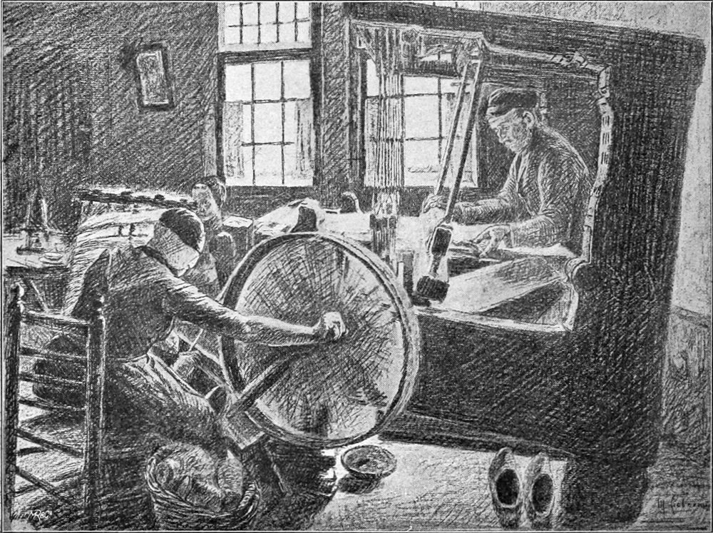 Nachdem der Künstler sich einmal der Freilichtmalerei zugewendet, haben ihn deren Probleme dauernd beschäftigt. In der 1882 entstandenen „Bleiche“ (Abb. 24) läßt er das Licht des Tages durch die dichtbelaubten Äste eines Birnbaumes über grünen Rasen und weiße Leinwand rieseln. Aber auch den Lichtwirkungen im Raume geht er noch weiter nach. Vor der „Schusterwerkstatt“ waren 1880 „Die Spinnerinnen“ (Abb. 17) entstanden, die zu dreien mit ihren Rädern um einen mit Kaffeeschälchen besetzten Tisch sitzen, während eine vierte am Herde im Winkel hantiert. Neben dem Herde ist links ein Fenster, durch das man in ein Gärtchen sieht. Das graue Tageslicht[S. 32] läßt die weißen Hauben der Alten aufleuchten und wird von einer hellen Wand reflektiert. Zu den feinsten seiner Bilder in dieser Art gehört jedoch „Der Weber“ (Abb. 27). Die Lichtquelle bilden zwei Fenster im Hintergrunde des engen Gemaches. Der Weber sitzt in seinem Stuhle und will eben einen neuen Faden einsetzen. Im Vordergrunde, auf einem Schemel, eine der reizendsten Gestalten, die Liebermann geschaffen, ein Mädchen, das mit einem großen Rade den Faden auf die Spule dreht. Es ist nun wunderschön zu sehen, wie das Licht über das Gewebe im Stuhl läuft, die verarbeiteten Züge des Webers beleuchtet, um schließlich auf dem Häubchen des Mädchens, dem verschlissenen Rot ihrer Taille, ihrem wohlgeformten Arm und dem sausenden Rade auszuruhen. Man muß schon Terborch citieren, um eine Vorstellung von der malerischen Schönheit der Kurbeldreherin anzuregen.