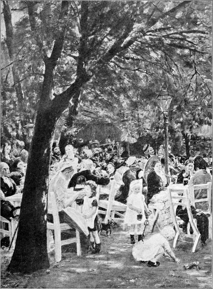 Wenn man von einer Menzelperiode Liebermanns sprechen will, so kann man[S. 33] es nur mit Hinsicht auf ein paar Bilder thun, in denen der Künstler es versucht hat, in der Art Menzels eine Vielheit von Erscheinungen in einem Bilde zu vereinigen. Das wichtigste dieser Bilder ist das 1883 gemalte „Münchener Bierkonzert“ (Abb. 28), dem 1878 ein weniger bekannt gewordenes, von einem englischen Kunsthändler falsch getauftes ähnliches kleines Werk „In den Champs-Elysées“ — es zeigt ein paar Kinderfrauen mit ihren Schützlingen auf einer Bank im Münchener Hofgarten — voraufgegangen ist. An Menzel erinnert vor allem die zeichnerische Durchbildung des Ganzen. Jedes der vielen Gesichter wirkt wie ein Porträt. Selbst den Posaunenbläser in dem Musikpavillon im Hintergrunde sieht man noch ganz scharf. Liebermann bewährt sich in dem Bilde, das bei Menzel vielleicht ein Gegenstück in dessen „Sonntag im Tuileriengarten“ hat, sowohl als Beobachter, wie als Psycholog; aber in mehr als einer Hinsicht bedeutet diese Leistung einen Schritt über Menzel hinaus. Vor allem ist das „Bierkonzert“ malerischer als das Menzelsche Bild, und die Pointen sind nicht unterstrichen. Liebermann hat nicht den Versuch gemacht, den Menzel nie unterlassen haben würde, den Beschauer mit einigen Gestalten in Verbindung zu setzen. Bei dem älteren Künstler wäre man sofort darüber im klaren: Mit dem Manne[S. 34] hat der Maler einen Dichter, mit jenem einen Lebemann, einen Künstler oder sonst einen in der allgemeinen Vorstellung gültigen Typus darstellen wollen. Diese billige Art, die Leute zu interessieren, hat Liebermann durchaus verschmäht. Eine Gruppe von so entzückender Natürlichkeit, wie die Kinderfrau mit dem kleinen Mädchen, das sie aus einem Glase trinken läßt, konnte nur Liebermann geben, und ein so kindliches Kind, wie den kleinen im Sande spielenden Blondkopf, hat Menzel in all’ seinen Bildern nicht aufzuweisen. Es ist ungemein viel Leben in dem Bilde, und es wird erhöht durch die überall umherhüpfenden Sonnenstrahlen. Vielleicht läßt noch die „Gedächtnisfeier für Kaiser Friedrich in Kösen“, 1888 gemalt (Abb. 50), an Menzel denken, an dessen „Gottesdienst in Kösen“; aber doch nur für einen oberflächlichen Beschauer. Liebermann gibt eine feierliche Impression von hohen grünen Bäumen, fröhlichem Sonnenschein und schwarzgekleideten Menschen, Menzel eine ausführliche Schilderung mit allerlei amüsanten Nebensächlichkeiten. Bei Liebermann ist die Natur die Hauptsache, bei Menzel die Gesellschaft, die den Gottesdienst im Freien in einem beliebten Badeort besucht.