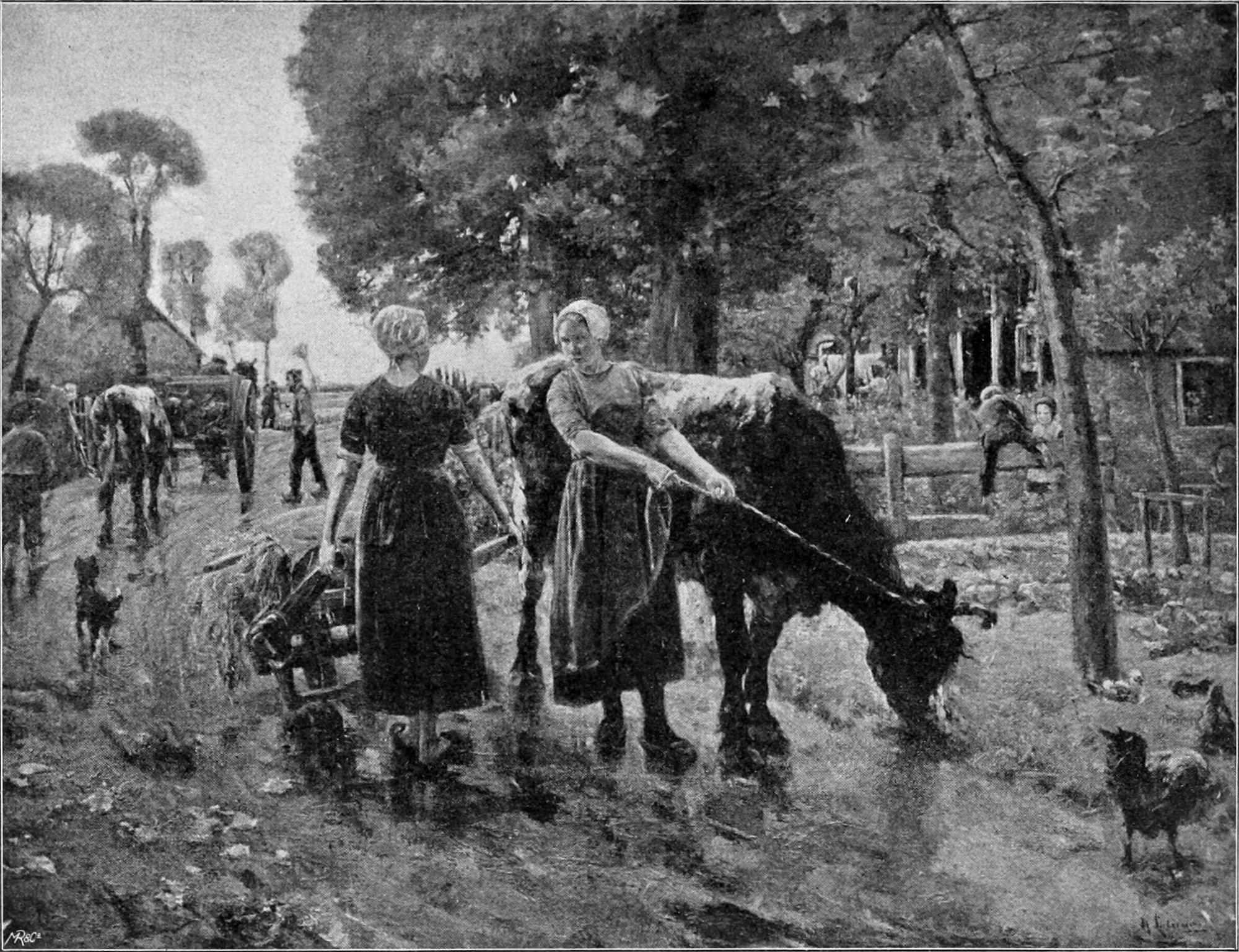 1884 beschäftigen den Künstler noch einmal „Waisenmädchen“ (Abb. 36), jetzt in der Hamburger Kunsthalle, 1885 malt er die „Holländische Dorfstraße“ (Abb. 37). Wieder Holland, wieder Freilicht. Auf der von einem heftigen Sommerregen nassen Dorfstraße begegnen sich zwei frische, junge Dirnen; die eine hat auf dem Felde Gras geschnitten, die andere will ihre Kuh auf die Weide führen. Die mit der Kuh bleibt stehen, die mit der Karre hält an, und es werden ein paar Worte gewechselt. Jede Bewegung ist ausgezeichnet beobachtet: Wie das Mädchen den Strick hält, an den die Kuh gefesselt ist; wie diese das Gras an der Straße abrupft, wie die zweite die Karre gefaßt hält, wie ein Mann in Holzschuhen über die Straße geht, ein Junge eine Kuh treibt, ein Ackerwagen dahinfährt, ein anderer Junge über einen Zaun steigt. Und alles wird von einem weichen, grauen Licht und feuchter Luft umspült. Die Pfützen auf der Straße spiegeln den Glanz des sich auflichtenden Himmels wieder, und die nassen grünen Blätter der Linden an der Straße schütteln sich über einem roten Häuschen.