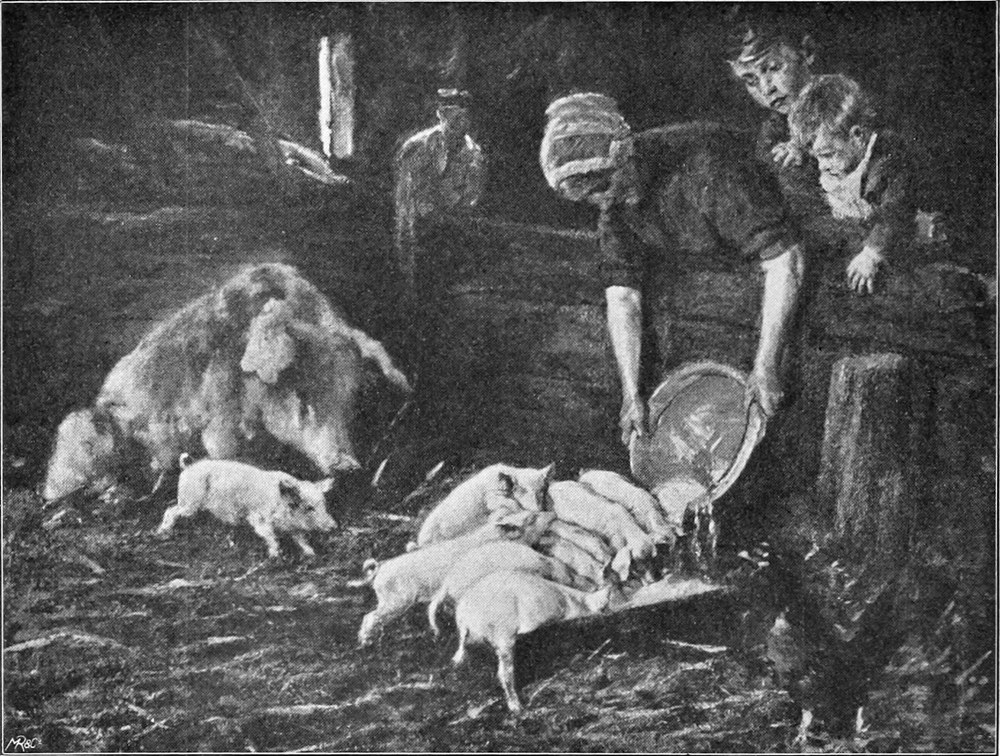Die 1886 gemalte „Schweinefamilie“ (Abb. 43) ist ein kühner Griff in eine bisher für nicht darstellungswürdig gehaltene Sphäre. Das Publikum sah nur, daß sich jemand erkühnte, ihm empörende Dinge anzubieten. Der Gipfel des Naturalismus schien erreicht. Daß es Kunst war, die sich darin offenbarte, wie Liebermann das lustige Gewuhsel kleiner Ferkel am Futtertroge dargestellt, beachtete man nicht. Dann kam die „Flachsscheuer in Laren“, das erste Bild des Künstlers, wo die zeichnerische Durchbildung zurücktritt und die Form nur noch durch Farbe unter Wirkung des Lichtes herausgebracht wird. Nicht allein die Arbeitenden scheinen sich zu bewegen, man meint auch die Bewegung der Luft zu sehen, die von den sausenden Rädern und fliegenden Spulen erzeugt wird. Man hat nicht mehr den Eindruck von etwas Beobachtetem, sondern den von Wirklichkeit. Noch gewaltiger erscheinen die atmosphärischen Mächte in den „Netzeflickerinnen“. Der Sturm braust, der salzige Odem des Meeres umhüllt Menschen und Landschaft. Nichts von Zeichnung im gewöhnlichen Sinne, aber großartige Silhouetten und eine Charakteristik der Bewegungen, wie sie noch nicht in der Kunst existiert hat. Dann die „Frau mit den Ziegen“. Es wird immer bewundert werden, wie Liebermann darin die Suggestion von Licht hervorruft. Gar keine Gegensätze von Hell und Dunkel, sondern eine fast gleichmäßige, trübe Farbe; dabei aber eine Leuchtkraft, als ob man in die Natur sähe. Man müßte schließlich wieder alle Bilder des Künstlers einzeln durchnehmen, um zu zeigen, wie er nicht nur[S. 69] durch neue, noch von keinem Früheren entdeckte Stoffe, sondern auch durch eigenartige Behandlung derselben wirkt.