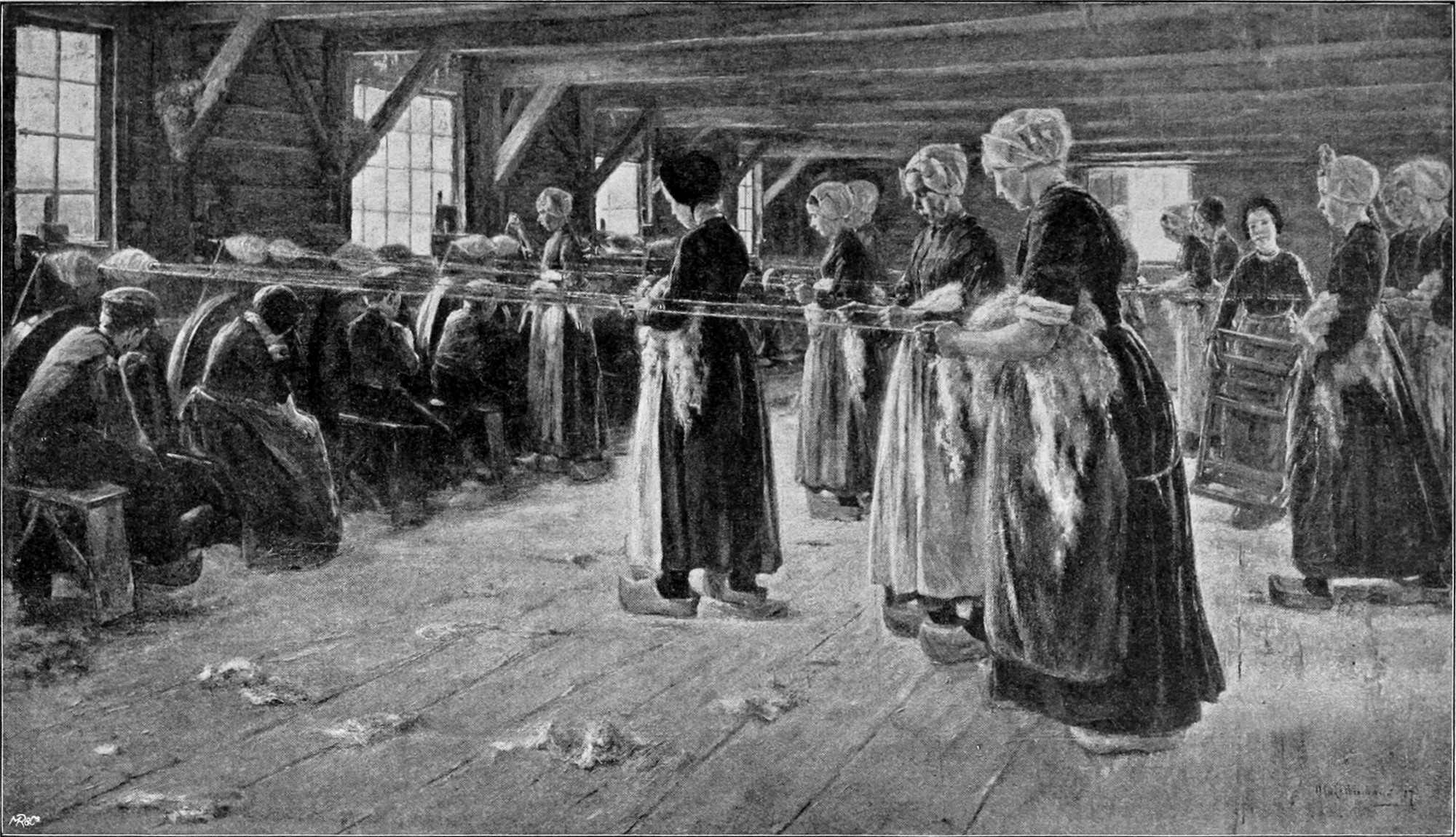Neben jenem Zantvoorter Bilde hat Liebermann dann noch einmal „Weber“ gemalt, keine Wiederholung des köstlichen Arbeitsidylls von 1882, sondern einen vergrößerten Betrieb mit vielen Personen und Maschinen, auch nicht mit so viel Intimität in den Einzelheiten, aber mit erhöhten Beleuchtungsschwierigkeiten.