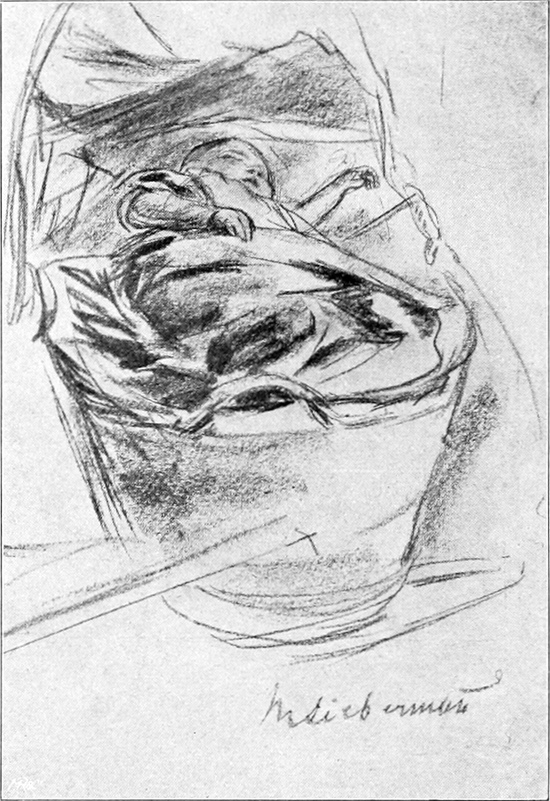 Max Liebermann ist ein Berliner Kind. Er wurde am 20. Juli 1847[1] als Sohn eines wohlhabenden Fabrikanten geboren, verlebte in dem behaglichen Heim seiner Eltern eine glückliche Jugend und bezog nach auf einem Gymnasium absolvierter Schulzeit 1868 die Berliner Universität, wo er sich in die philosophische Fakultät inskribieren ließ; freilich ganz gegen seine Neigung und nur, um ein Zerwürfnis mit seinem Vater zu vermeiden, der von dem Wunsche des Sohnes, Maler zu werden, durchaus nichts hören wollte. Aber anstatt sich mit den Ideen Schellings und Hegels bekannt zu machen, zog es der junge Liebermann vor, heimlich die Akademie zu besuchen und sich von Karl Steffeck in der Kunst des Malens unterrichten zu lassen. Er malte und zeichnete in dessen Atelier Menschen, Pferde, Hunde und war nach einem Jahre[S. 8] so weit vorgeschritten, daß er an Steffecks großem Bilde „Sadowa“ mitmalen durfte. Aber obgleich sich der Lehrer von seinen Leistungen für befriedigt erklärte — Liebermann selbst fühlte die Unzulänglichkeit seiner Ausbildung zu lebhaft, als daß er Genüge an seinen Schülererfolgen gefunden hätte. Mit Einwilligung seines Vaters, der sich am Ende doch entschlossen hatte, der Neigung des Sohnes freien Lauf zu lassen, ging er nach anderthalbjährigem Studium bei Steffeck im Jahre 1869 nach Weimar. Es war nicht Sympathie für den dort noch vorhandenen Überrest von klassizistischer Kunst, die den jungen Künstler dorthin führte. Aber in der Stadt Goethes wirkte als Lehrer an der Kunstschule der Belgier Ferdinand Pauwels (geb. 1830), der als Schüler Wappers den glänzenden malerischen Stil und den Realismus der belgischen Historienmalerei mitgebracht hatte. Liebermann ging nun systematisch zu Werke; er zeichnete bei Thumann fleißig nach Gips und malte bei Pauwels; jedoch seine Versuche, Bilder in der Art seiner Lehrer zu malen, schlugen durchaus fehl. Da brachte ihn der Zufall auf einen Weg, der künftig sein Weg werden sollte. Nach einer glücklich überstandenen Krankheit spazierte er an einem Sommermorgen vor den Thoren Weimars. Auf einem Felde, an dem sein Weg vorüberführte, sah er einen Bauer mit seinen Leuten arbeiten, und wie er gern erzählt, ist ihm beim Anblick dieser fleißigen Menschen zuerst der Gedanke gekommen: Das mußt du malen,[S. 9] genau so, wie es ist. Wenn es nun auch nicht sofort dazu kam, so war sich der junge Maler doch darüber klar geworden, was ihn künstlerisch zu reizen vermochte. 1873 entstand Liebermanns erstes größeres Bild „Die Gänserupferinnen“, jetzt im Besitze der Berliner Nationalgalerie. Als Malerei, trotz dem von Munkaczy übernommenen schwärzlichen Kolorit, ziemlich akademisch, erregte es durch seinen Inhalt überall den heftigsten Anstoß. Man fand es unerhört, dem Publikum den Anblick eines so gewöhnlichen Schauspieles zu bieten: Alte häßliche Weiber in einer schwärzlichen Scheune bei einer zwar nützlichen, aber doch eigentlich gemeinen Arbeit. Indessen das Bild machte, wo es auch gezeigt wurde — in Weimar, Hamburg und Berlin — Aufsehen und fand schließlich, obwohl sich die gesamte Kritik gegen den „Rhyparographen“, den „Apostel der Häßlichkeit“ Liebermann aussprach, seinen Käufer. Das erhaltene Geld benutzte der ermutigte Künstler zu einer Reise nach Paris, wo er sich sogleich mit Munkaczy, den er in jener Zeit besonders lebhaft verehrte, in Verbindung setzte. Ein Abstecher nach Holland ließ ihn das Motiv zu den „Konservenmacherinnen“ finden, die er, nach dem kurzen Ausfluge nach Weimar zurückgekehrt, sofort in Angriff nahm.