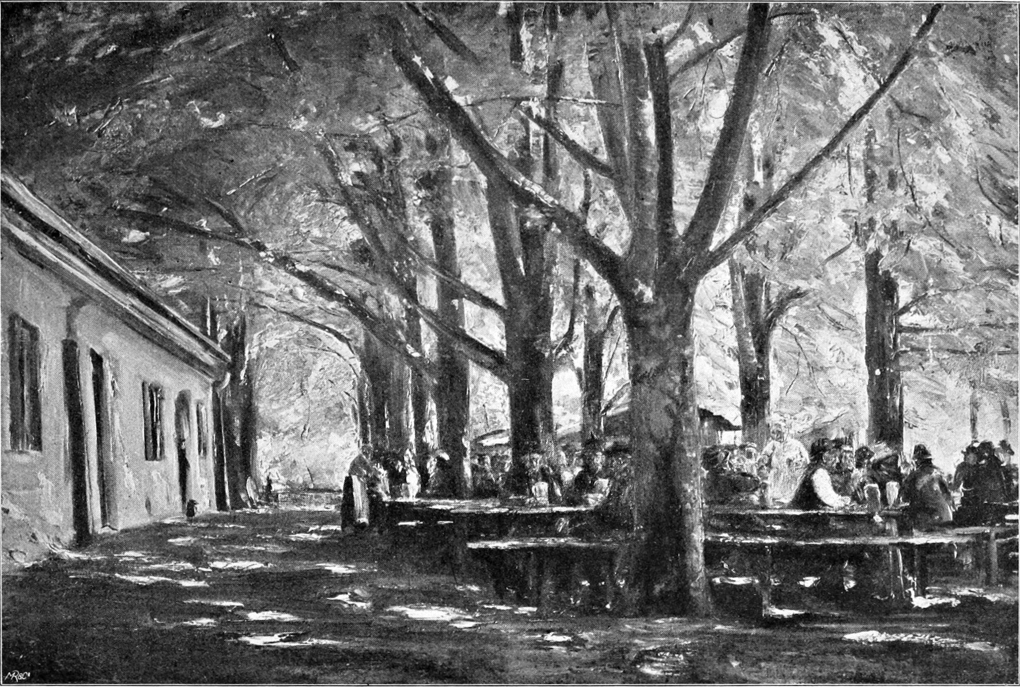 Eine Sommerreise in die bayerischen Vorberge und nach Tirol 1893 lenkt die Aufmerksamkeit Liebermanns auf ein Problem, das ihn schon in dem „Altmännerhaus“ beschäftigt hatte: die Darstellung von Luft und Sonne unter dem Grün der Bäume. Der Künstler hatte bemerkt, daß die Bewegung der Blätter dem Sonnenlicht etwas Flimmeriges gibt, und daß dieses Flimmern das Auge verhindert, einen Gegenstand in festen, bestimmten Formen zu sehen. Um also einen der Wirklichkeit ähnlichen Eindruck hervorzurufen, mußte auf etwas verzichtet werden, was bisher als ein wichtiges Erfordernis in der Malerei galt, auf ein ausführliches Betonen der Form. Der Künstler sah häufig unter der Wirkung des zerstreuten Sonnenlichts nur einen aufleuchtenden Farbenfleck, wo bei stetigem Licht unbedingt auch die Form vollkommen zur Geltung gekommen wäre. Die Illusion des unter einem Blätterdache gefangenen Sonnenlichtes ließ sich nur erreichen, wenn die aufdringliche Sachlichkeit beseitigt wurde. Liebermann malte jene bekannten „Alleen in Rosenheim“, wo die Sonne über dichten grünen Buchenkronen steht und ihre Strahlen über den Waldboden tanzen läßt, immer und immer wieder, bis er die Schwierigkeiten so weit überwunden zu haben glaubte, um auch eine kompliziertere Aufgabe dieser Art bewältigen zu können. Sie bot sich ihm in dem hübschen Städtchen Brannenburg, nicht weit von Kufstein gelegen, wo es einen berühmten Biergarten mit schönen hohen, alten Bäumen gibt. Diesen „Biergarten in Brannenburg“ (Abb. 67) hat Liebermann an einem schönen Sonntag, wenn von nah und fern Gäste herbeiströmen, um sich an dem guten Biere des Wirtes im Schatten der Bäume gütlich zu thun, gemalt. Die langen Bänke neben den langen Tischen sind von Eingeborenen, Sommergästen und Fremden dicht[S. 44] besetzt. Aus dem alten Wirtshaus links werden die Maßkrüge getragen. Man ist lustig und guter Dinge; denn das Bier ist gut, und der Aufenthalt unter den schattigen Bäumen angenehm. Man sieht sie alle dasitzen, die braven Leute in der grünen Dämmerung, aber der vorwitzige Sonnenschein blendet. Man bemerkt schon, daß da eine Bäuerin mit weißen Hemdsärmeln, dort ein reicher Viehhändler, hier ein Stadtherr sitzt, aber man erkennt die Menschen mehr an ihrer charakteristischen Haltung, an einem besonderen Hut, an der aufleuchtenden Farbe des Gewandes als an ihren Gesichtern. Die Illusion jedoch, daß man in einen wohlgefüllten Gasthofsgarten voll schöner Buchenbäume blickt, in dem die Sonnenstrahlen neckisch über den saubergekehrten Gang, über Tisch und Bänke und die Köpfe der Leute hüpfen, ist vollkommen erreicht. Das Liebermannsche Bild, eins der frischesten und heitersten, die er gemalt, hängt jetzt im Luxembourg-Museum in Paris, für das es vom französischen Staate erworben wurde. Ein noch komplizierteres Thema behandelt der Künstler in dem „Schweinemarkt in Amsterdam“ von 1895, wo ein Durcheinander von hin- und hergehenden Menschen, von Sonne, Luft und Farben zu einem Bilde wechselvollster Lebensbethätigung gesammelt erscheint.