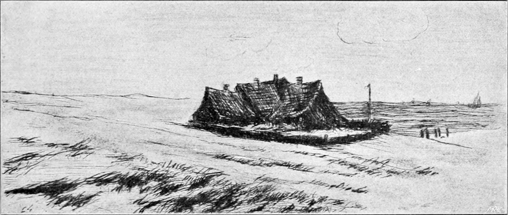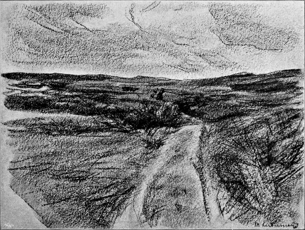 Was an den Handzeichnungen des Künstlers zu rühmen war, gilt natürlich auch für seine Radierungen. Es ist klar, daß jemand, der so malerische Zeichnungen produziert, auch in seinen Nadelarbeiten nach ähnlichen Wirkungen strebt. Zu den Tugenden von Liebermanns Handzeichnungen treten nun noch die Zufälligkeitsreize der Radierung. Zu leichte oder zu starke Ätzung der Platte, Verletzungen des Ätzgrundes, Entgleisungen der Nadel, stehengebliebener Grat u. s. w. Vor einem Teil seiner Radierungen muß man fast an Kohlenzeichnungen denken, so derb und rauh und breit ist die Nadel über die Kupferplatte gefahren. Eine Zeit lang hat er die Technik des vernis mou sehr bevorzugt;[S. 60] denn diese Art, wo die Zeichnung auf einem über den erweichten Ätzgrund gelegten dünnen Papier gemacht wird, gewährte ihm die Möglichkeit, etwas herauszubringen, was seinen Handzeichnungen ähnlich sah und gelegentlich noch malerischer wirkte. In der letzten Zeit findet er Vergnügen daran, mit der kalten Nadel zu arbeiten. Die äußerst feinen Linien, die die Schneidenadel in das Kupfer gräbt, sind sehr geeignet, die Farblosigkeit von Dünenlandschaften, die weiche verschleiernde Luft der Küste und duftig in der Ferne auftauchende Kirchtürme und Maste wiederzugeben (Abb. 80). Und gerade diese Blätter sind es, vor denen die Erinnerung an Rembrandt wach wird, an die sich weithin dehnenden Ebenen und freien, hohen und weichen Lüfte seiner radierten Landschaften.