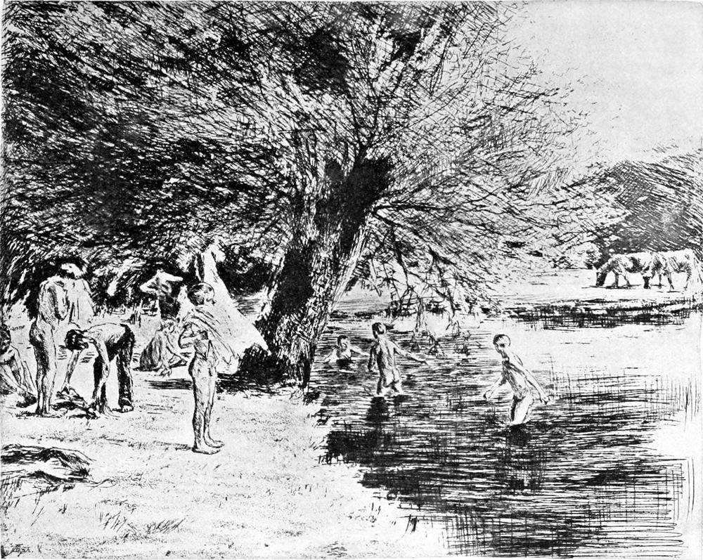 Immer lebhafter fühlt sich der Künstler von solchen schwierigen Lichtproblemen angezogen. Es reizt ihn, den Glanz der Sonne auf unbekleideten Menschenkörpern zu malen, Reflexe wiederzugeben, die von lichtgetroffenem Wasser und blitzendem Dünensande herrühren, und er nimmt nach einem Aquarell, das badende Jungen an[S. 47] einem Landsee zeigt, — auch als Radierung vorhanden (Abb. 84) — das große Bild „Badende Jungen in Zantvoort“ (Abb. 86) in Angriff. Liebermanns Farben sind nie die hellsten gewesen, und es ist nicht unwahrscheinlich, daß seine „Badenden Jungen“ etwa neben der bekannten „Badenden“ von Anders Zorn trübe und grau wirken würden; aber an sich ist das Liebermannsche Bild so hell, so voll von Sonne, daß man förmlich geblendet ist, wenn man längere Zeit auf diese von strahlendem Licht überschütteten Knabenkörper, die glänzendweißen Hemden, den blinkenden Dünensand, das funkelnde Wasser geschaut hat. Und welche Lichtwogen wirft erst der halbbedeckte Himmel dem Beschauer ins Auge! Dabei ist nicht eine harte Farbe, kein einziger starker Kontrast in dem Bilde. Milde und weich umflutet die feuchte Luft alles: Land, Wasser und Menschen. Zugleich bietet das Bild eine Fülle von Bewegungsmotiven. Alle Stadien des Anziehens und des Abtrocknens. Diesen „Badenden Jungen“, die allerdings bereits gebadet haben, von 1896 hat Liebermann 1899 eine wirkliche Badescene entgegengesetzt, die die Jungen im Wasser zeigt, unter leicht bedecktem Himmel, noch überzeugender und bei aller Helligkeit wunderbar stark in der Farbe (Abb. 112). Ein Meisterwerk!