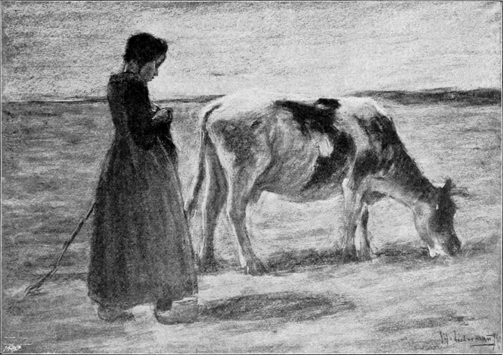 Liebermanns Stoffkreis ist nur äußerlich charakteristisch für das Wesen seiner Kunst. Nicht menschliches Mitleid ließ ihn Gefallen finden an armen Arbeitern und Bauersleuten, sondern der Instinkt, daß bei ihnen und auf ihrer Scholle viel mehr für einen Künstler zu holen war, als zwischen den Mauern der Stadt. Weil er sie nicht mit den Augen eines sich klüger, gebildeter oder wohlhabender Dünkenden ansah, weil er sie nicht dem Gelächter preisgab, weil er sie in seinen Bildern weder Komödien, noch Tragödien aufführen ließ,[S. 72] mußte er sie durchaus aus Mitleid malen. Mit demselben Rechte könnte man behaupten, Menzel zeichne einen Pferdemaulkorb aus der Barockzeit aus Freude darüber, daß man den Tieren in unserer Zeit, auch wenn sie bissig wären, ein so schweres Martyrium nicht mehr zumute. Es ist bezeichnend genug, daß man nach menschlichen Vorwänden auch da forscht, wo künstlerische genügen könnten und sollten. Schließlich ist es doch eigentlich Holland, das Stück Erde, wo eine wassergesättigte Luft das Licht heller, die Umrisse weicher, die Farben harmonischer macht, was Liebermann dazu bringt, Fischer und Schäfer, Arbeiter und arme Leute zu malen. An Hollands Atmosphäre konnte er die Bewegungen des Lichtes, an seiner Bevölkerung Bewegungsmotive der menschlichen Gestalt besser beobachten, als irgendwo. Das war für ihn entscheidend und vielleicht dazu der Wunsch, den Leuten, die vom Künstler ideale Erscheinungen verlangen, zu zeigen, daß man dieser nicht bedürfe, um sich als Künstler zu legitimieren.