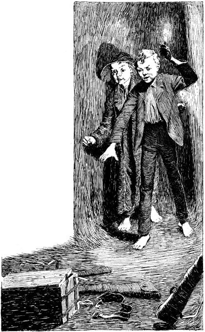 »Jetzt, Huck,« rief Tom, »verstecken wir das Geld im Holzschuppen der Witwe Douglas, und morgen früh komm' ich dann und wir zählen und teilen den Kram und suchen dann im Wald nach einem Platz, wo wir ihn sicher vergraben können. Du bleibst jetzt hier ruhig liegen und bewachst die Herrlichkeit, ich hol' indessen geschwind Meister Taylors Handkarren. Bin gleich wieder da!«