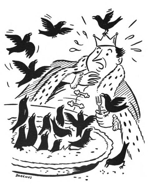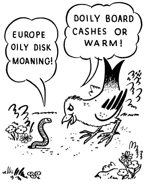 As your Anguish vocabulary increases, you’ll find that your English vocabulary does, too, but you must be careful not to mix them up—something which people orphan do when they begin to use words accordion to the way they sound rather than how they’re spelled. Words which are rare in English are often common enough in Anguish, so you have new opportunities to see them. Suppose you’re spending a week-end reciting nursery rhymes in Anguish to a happy group of children[15] or immature adults, and come across SING A SONG OF SIXPENCE, A POCKET FULL OF RYE. In Anguish, this, of course, is SINKER SUCKER SOCKS PANTS, APOCRYPHAL AWRY. This will give you an unexpected chance to use the last two words.
