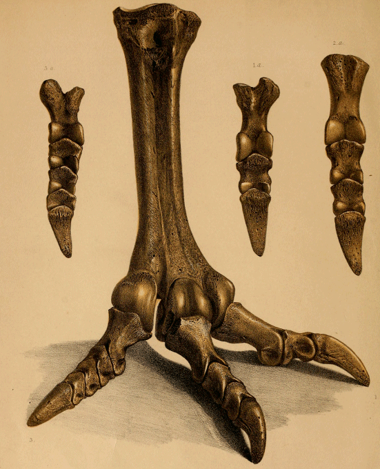 FIGURES 1a 2a 3a THE PLANTAR OR UNDER SURFACE OF THE FIRST, SECOND & THIRD TOES. THE FIGURES ARE 1/3 NATURAL SIZE LINEAR. THE ORIGINAL BIRD WAS ABOUT 10 FEET HIGH.