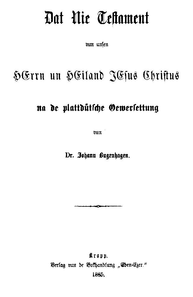 Min leeve Leser! Dörch GOtt’s Gnad is dat plattdütsche nie Testament un de Psalmen na de Öwersettung vun Dr. Johann Bugenhagen nu fardig warn, un dat grad in dat Jahr, da wi GOtt darvör danken doht, dat düsse true Mann vör veer Hunnert Jahrn to Welt kamen is. De HErr ward nu de Gnad ok geven, dat Sin hillige Wort in de plattdütsche Sprak de plattdütschen Christen wedder wat nutzen deiht, damit se uns’ HErrgotts Wort richtig verstahn lehrt. Ik höp, se ward dat denn ok richtig to Harten nehmen, denn to de Tied, as dat Evangelium in uns’ Modersprak predigt war, harr dat Christendom doch en anner Utsehn, as hüt to Dags. Do wulln de Lüd ok so leven, as se lehrt warn. Nu awer wüllt se so lehrt warrn, as se leven muchen. De Plattdütschen sünd awer ümmer Lüd west, de wenig snackt, awer veel dahn hebbt, de nich för de Fedder, awer fört Handanleggen weern. Se sünd ümmer Lüd wesen, de langsam wat faten dän, harrn se dat awer eenmal fat, so heeln se dat ok fast un stunn darvör in up Leven un Dod. Ik höp, dat plattdütsche Christendom schall dat ok noch wedder bewiesen, un wenn dat darhen kummt, denn schüllt ji mal sehn, denn hett dat Art mit dat Christendom. Un dat wull ik so geern beleven, dat wi hier in Norden, in plattdütschen Landen, son Christendom wedder kreegen, daran man sin hartlich Freud hebben kann, so dat man dat garnich begriepen kunn, wa dat Minschen geven mag, de keen ordentlige Christen wesen wüllt. Un dat höp ik heel seker, dat de plattdütsche Bibel darto wedder helpen ward, dat GOtts Wort vun veele Lüd wedder beter verstahn ward. Wenn man’t eerst richtig versteiht, denn mutt man dat wol leef hebben, dat is gar to söt darto. Un wenn man’t leef hett, denn will man ok darna leven, denn dat is gar to leevlich un bringt den rechten Freden.