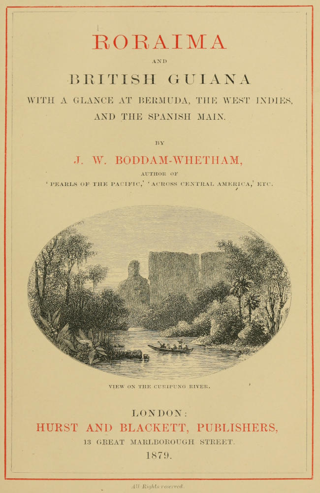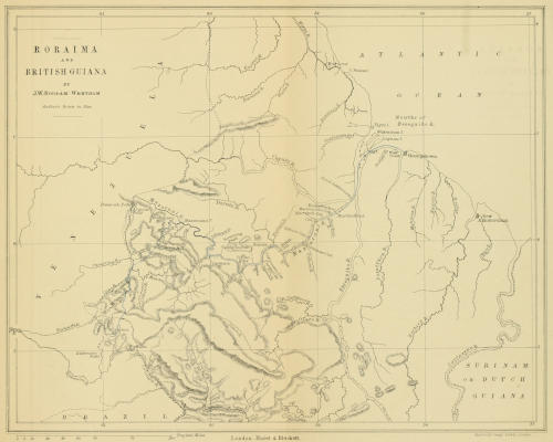 Full then, of curiosity, with a great longing to become better acquainted with this mysterious region, I arranged my plans so as to arrive in Demerara about January, paying a flying visit on my way to Bermuda viâ New York, and so on through the West Indies to Guiana. Fortune favoured me, inasmuch as on my arrival at Georgetown, Demerara, I found that the Colonial government was about to send an expedition to Roraima, for the purpose of trying to reach the top of that mountain. With great kindness, the authorities permitted me to accompany it, and I cannot let this occasion pass without expressing my sincere thanks for the opportunity thus afforded me of visiting the interior of British Guiana.