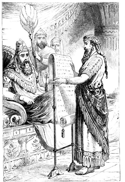 That night King Ahasuerus could not sleep. Those peaceful slumbers which the meanest of his subjects could enjoy, fled from the eyelids of the monarch. It does not appear, however, that the rest of the despot was destroyed by any thought of the thousands of innocent families doomed by his caprice to destruction. Unable to obtain sleep, the king ordered that the book of records should be brought and read before him; and as he listened to the account of the events of his reign, the conspiracy of his servants, and the means by which the dangerous plot had been discovered, were brought to the remembrance of the monarch. [Pg 38]
