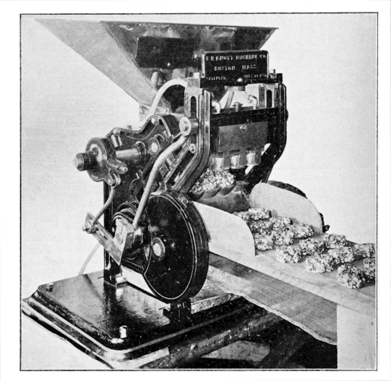 Make five batches: first, molasses; second, vanilla; third, chocolate; fourth, wintergreen; fifth, molasses. Fine pop-corn. Each batch is panned, pressed one inch thick and cut up in rack; make as many piles[p. 52] as you run pans; place the vanilla on top of the molasses. The cutting rack has a beveled edge so that it will easily slip over the previous sheet to register the cut cakes one on top of the other. When the five sheets are piled you can easily separate the bricks for wrapping. Use Knott’s Brick and Bar Cutting Machine, it does the best work.