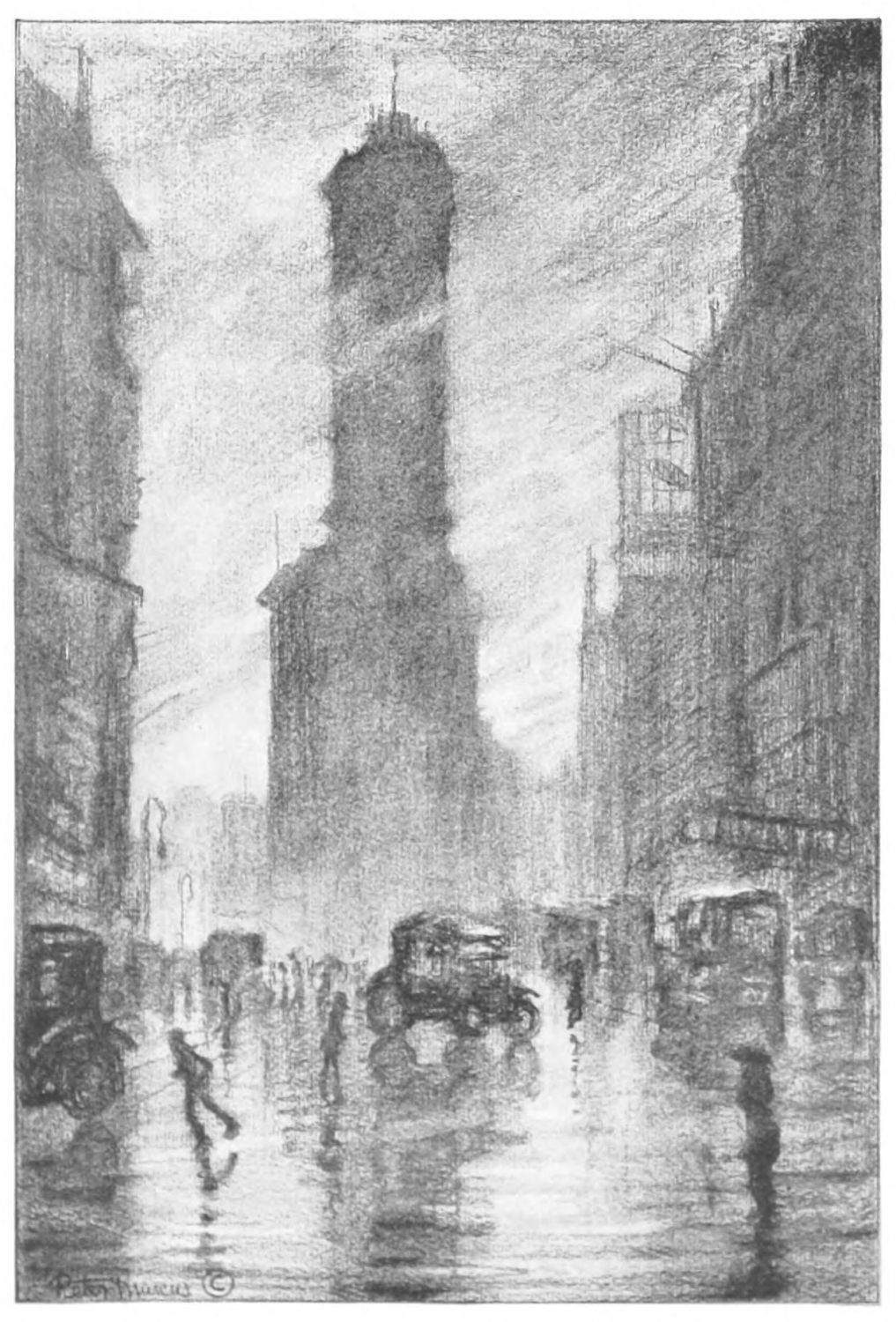 Hopkinson Smith once said that Venice is nothing but air and water. There all else has been so softened and moulded and enveloped as to become part and parcel of sea and cloud. The portrayal of this is preëminently a painter’s job. But New York, in addition to being a lot of other things, is a Venice in the making, and all the ugly paraphernalia by means of which this making is slowly going forward, all the unlovely processes, physical and chemical, structural and commercial, must be recognized and expressed and by the light of poetic vision be made a part of its beauty and romance.
