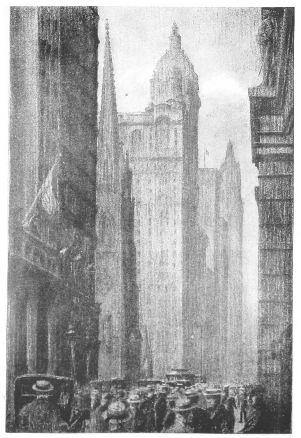 HERE is the force of the sea and the romance of a fairy tale. Here immense fortunes are won in a day and lost in less, and the hopes and savings of years vanish in an hour. Here are bank messengers who become millionnaires overnight and capitalists who awake penniless. It is the market of the whole country and of others. Here are corn and wheat heaped in huge confusion, millions of bales of cotton and barrels of oil, high-piled above the sky-scrapers. Railroads, steamers, banks and bullion; raw gold and ore, coal, silver and copper, mounting to the clouds in glimmering pinnacles and smoking hills. And through it all and around it all, pulses the restless swing and change, the tireless tide of “the street.”