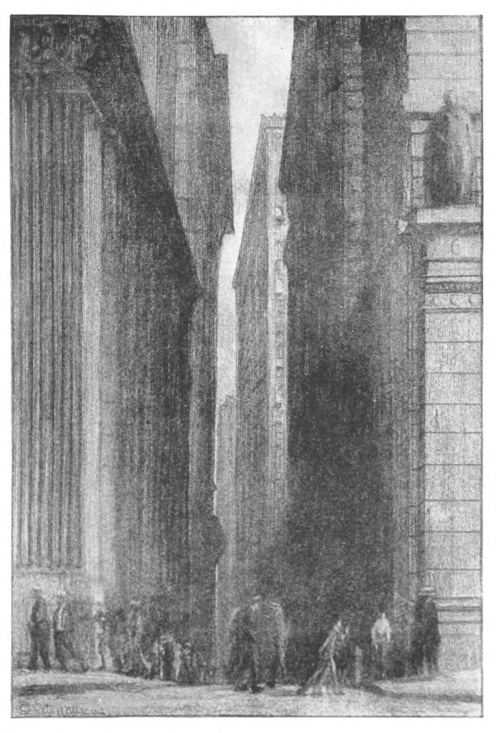 RUNNING east from Broadway, just below Wall Street, is Exchange Place. It is a narrow street and a short, but it is not a little street. Huge buildings are its walls, which seem almost to meet overhead. Straight up they tower, face to face, staring at each other with countless eyes. Daily into these few buildings come thousands and thousands of people: old and young, gay and sad, financiers and office boys,—to work. It is a good-sized town in one street. It is a veritable cañon of the city.{21}