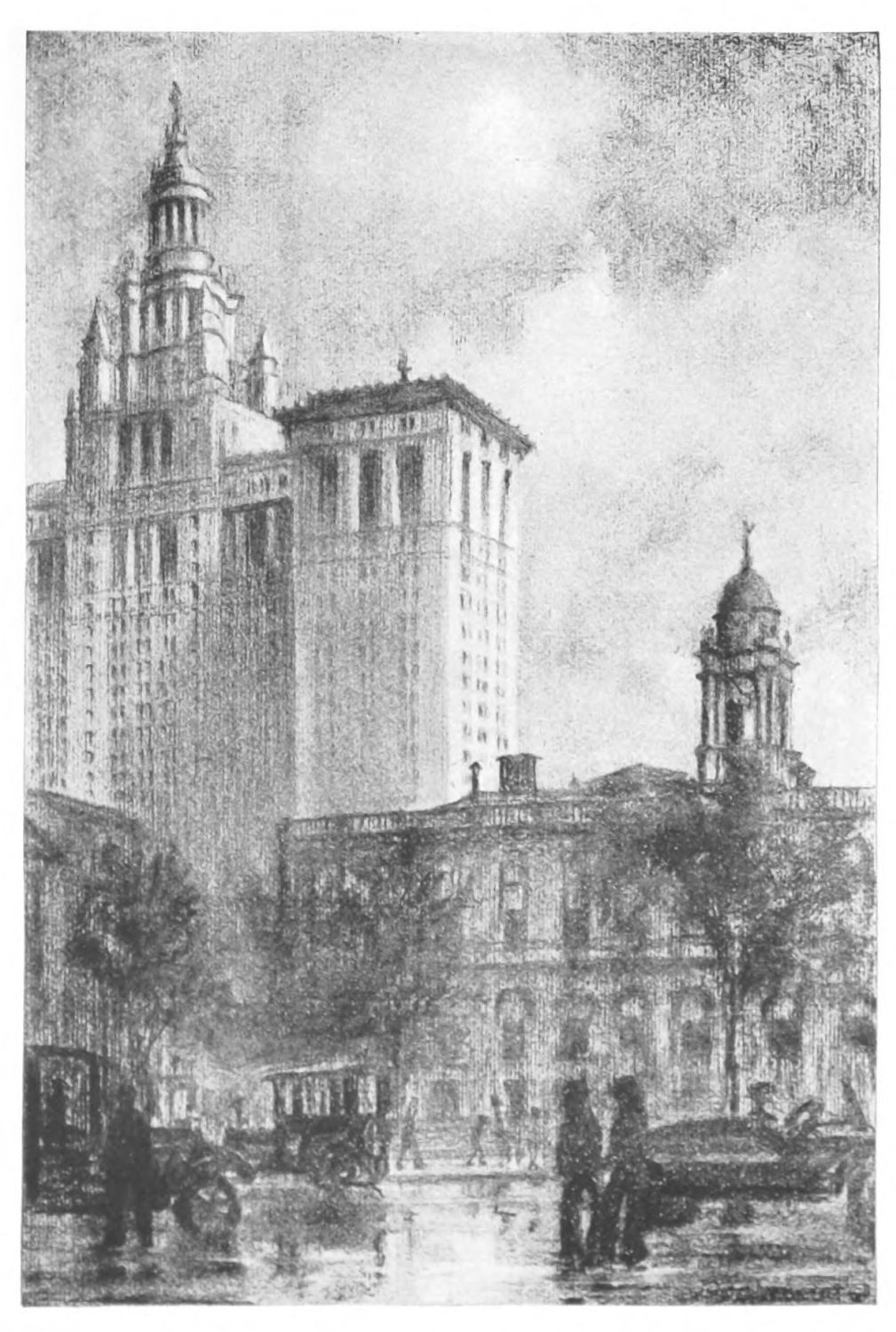 ASTRIDE of Chamber Street at Park Row stands the Municipal Building. Under its roof are half a hundred commissions, departments, boards and bureaux that regulate such petty affairs as the highways, parks, water supply, bridges, taxes and fire-fighting for upwards of six millions of people. A gigantic task, and accomplished in a building well worthy of its responsibility.{37}