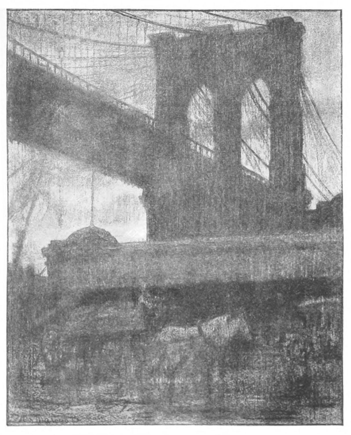 LIKE twin Colossi, silent amid the hum of cities and the whistling of a thousand boats, the grim piers of Brooklyn Bridge stand sentry at the river’s gate.{35}
