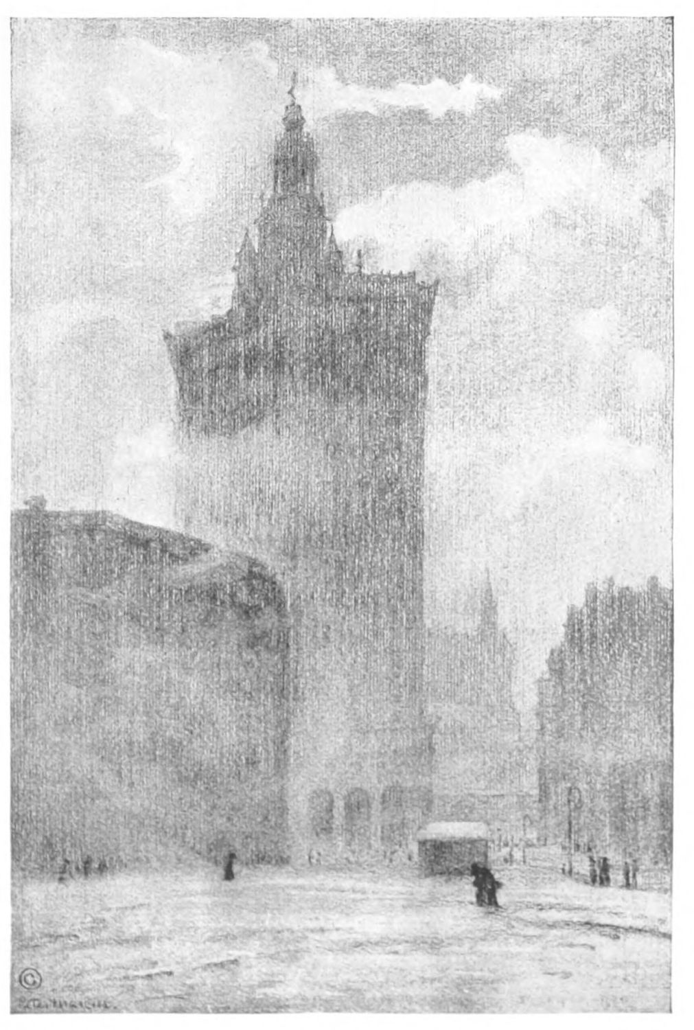 IF Father Knickerbocker should come over to New York on the Fulton Ferry, as in times gone by he used to do, when he had been visiting his respected neighbors on Brooklyn Heights; and if he should stand on South Street and look up Peck Slip and see it as it is to-day—how he would stare through his horn-rimmed spectacles and how his dear old heart would thump under his brass-buttoned coat! How he would pinch himself and wonder what it all could mean! What was that enormous shaft all white and glowing in the afternoon, rising eight hundred feet or eight thousand to the very sky? What were those towers, spires and turrets, soaring above the clouds, the brilliant sunlight gilding their countless feathers of steam and decking their phantom minarets with myriad candles? What could it mean? Had he landed on Manhattan or was this some island built by fairies or by elves? Nay, this place was far too fair for that, and must be then the work of witchcraft and the devil. Or was it, after all, the same old place that he had known, but grown and glorified beyond belief? And when he finally realized this to be the case, Father Knickerbocker without doubt would be wondrous proud of his great-grandsons and of the New York of to-day.{33}