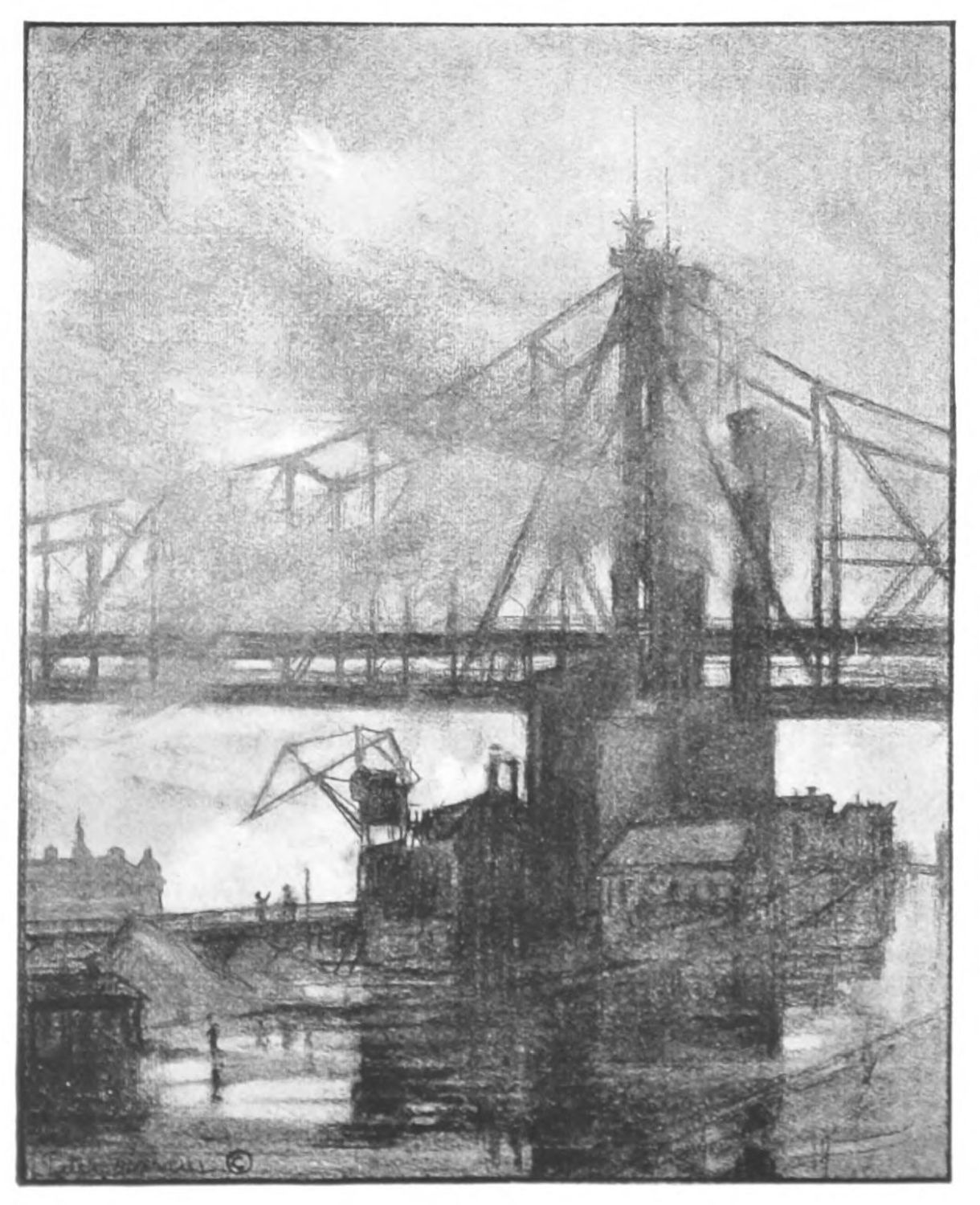“The Old Bridge,” “Washington Bridge,” “Queensboro Bridge,” and “The Viaduct,” fall naturally into a third group. Here we have a different manifestation of energy, the architecture of the engineer, crisp and nervous in rendering, beautifully expressive of structure unadorned.