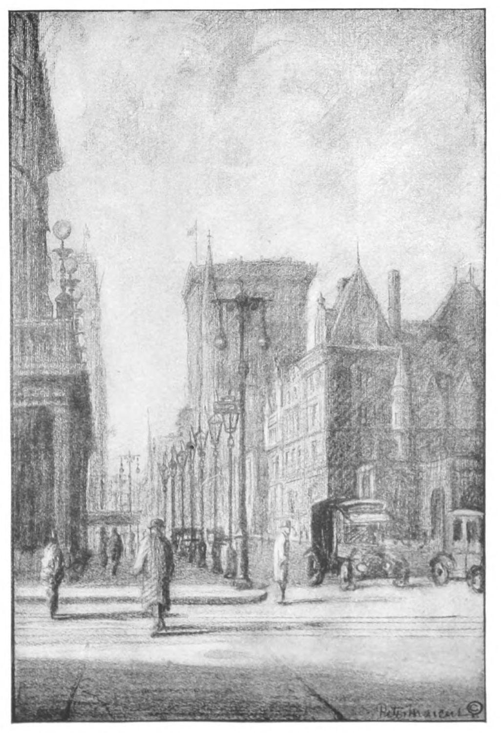 THE changes in New York in the last hundred years have been almost fabulous and yet the greatest of all perhaps has been lower Broadway. The proud steeple of Trinity Church once dominated a scene of fashion. It is now surrounded, dwarfed, overshadowed. Once Beaux and Belles, in Brummel-like hats and directoire skirts, came grandly here to worship,—and meant it. To-day, one picnics in the church yard and eats luncheon bananas on the graves. The enormous buildings of commerce, finance and trade are filled to overflowing. Here is progress, wealth and unlimited resource. It is a tremendous hive full of golden honey. And it is doubtless very good. But it is also good that this small church of a bygone time, still stands undaunted,—respected among these colossal towers; and that it still brings from the past some of that calm strength that is of even more lasting stuff than the masonry of the church itself, and that through it, the spirit of Old New York still “carries on” in Lower Broadway.{19}