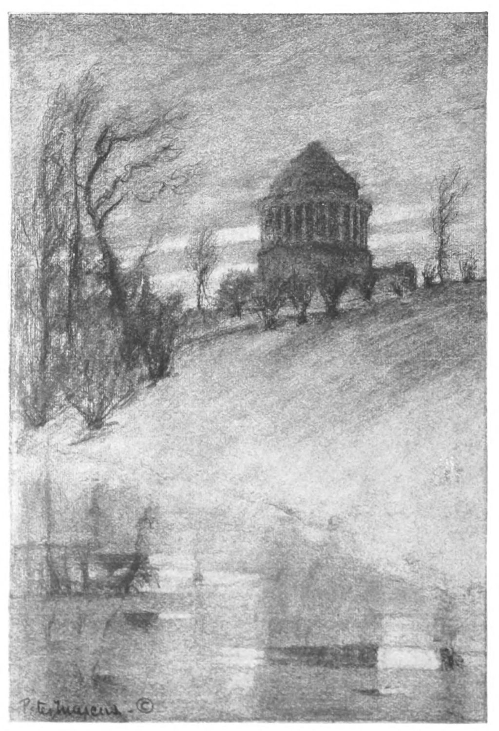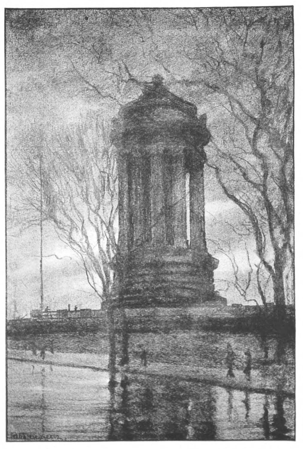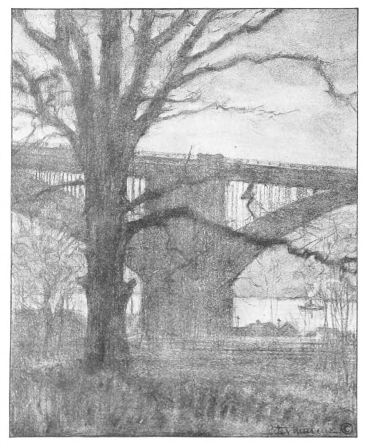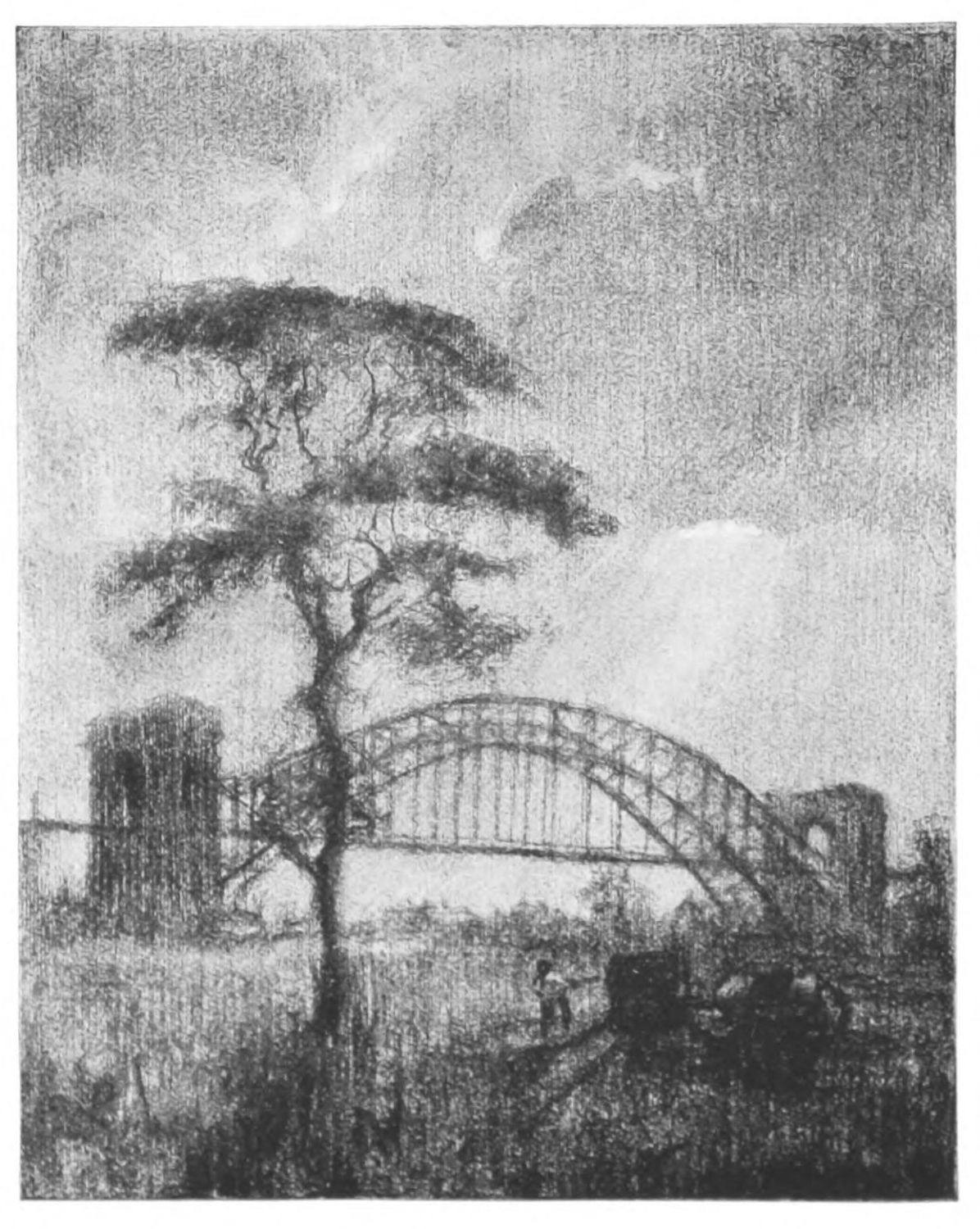 If in the drawings thus far mentioned certain qualities of Piranesi, Méryon and Brangwyn are brought to mind; in “High Bridge,” “The Soldiers’ and{13} Sailors’ Monument,” “Hell Gate Bridge,” “Grant’s Tomb,” and “The Cathedral on the Heights,” there is equally a suggestion of Whistler. Less vigorous than the others in draughtsmanship, they are full of the suggestion of subdued color. By reason of the more subtle quality of their rendering, they lend themselves less readily to reproduction but even the reproductions convey beautiful impressions of shadowy foliage and quiet waters, bare, wind-swept branches and lonely spaces.