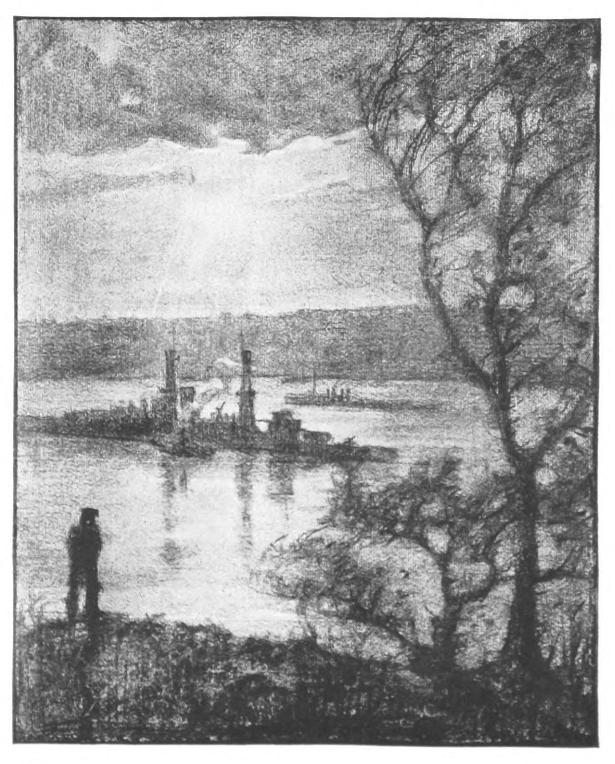 IT often seems more difficult to recognize beauty in things with which we are familiar than in those which are more foreign to us. The Hudson is, beyond question, as splendid a river as any of which European cities can boast, yet visitors to New York often seem to appreciate it more than do the New Yorkers themselves. Whether twinkling under myriad lights on a summer night, or storm lashed in January, the Hudson sweeps the whole west shore of Manhattan in lasting yet ever changing grandeur. Imagine yourself in an unknown, distant city, and watch the sun go gorgeously down behind the Palisades, while on the water its long reflection is ploughed to pieces by the river craft.{59}