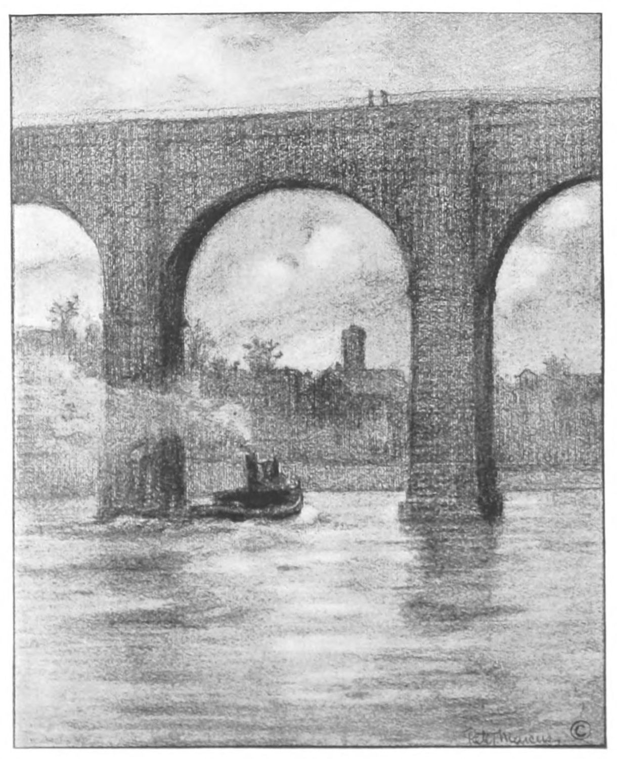 BOLDLY across the Harlem River at One Hundred and Seventy-fourth Street stands High Bridge. It differs remarkably from other New York bridges in that it is built entirely of masonry. No steel construction, no suspension cable, no huge rolling lift or counter-poise relate it to the present dynasty of bridges. One hundred and thirty-five feet of solid stone it rises gray and enduring amid the surrounding green. Surely it belongs to the Old World and to another time, and looking through its arches one half expects to see the towers and battlements of some old chateau, clear cut against the sky. One may even fancy,—but here a blunt-nosed tug rams puffing up against the tide, smoke belching from its stumpy funnel, the water churned to froth; and one has lost the wonders of the past in wonders of to-day.{61}