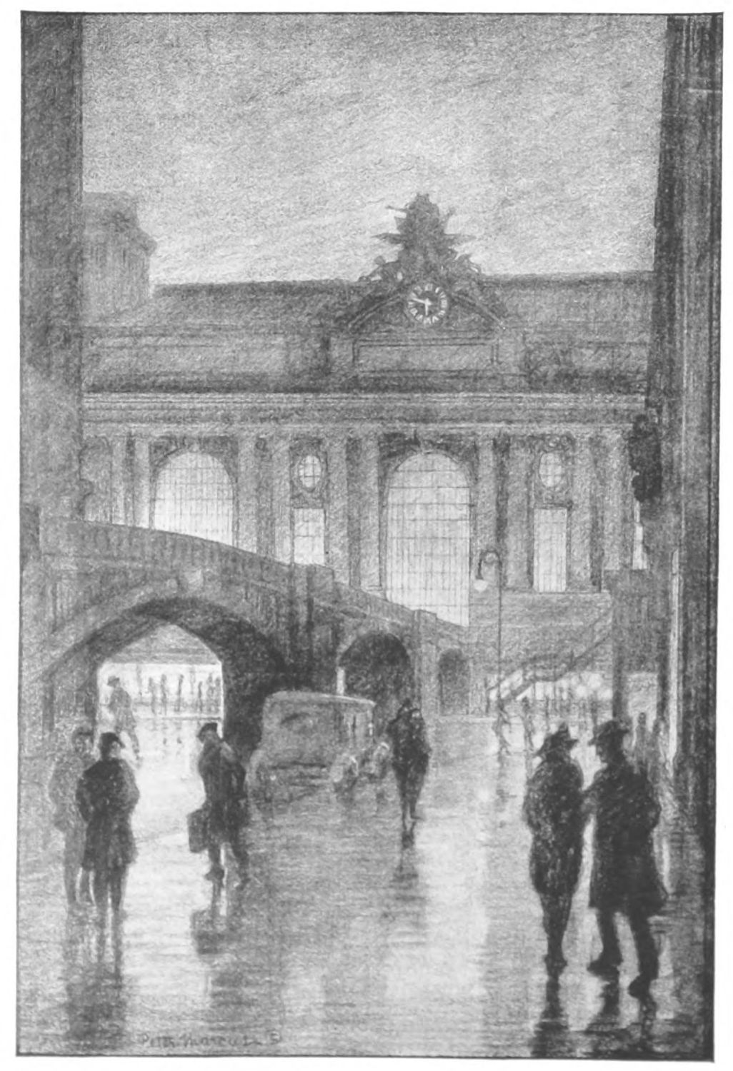 THE GRAND CENTRAL is one of the finest railroad stations in the country. Fronting on Forty-second it extends to Forty-fifth Street and from Vanderbilt Avenue to Lexington. The group of figures forming the clock cartouche above its main façade is a piece of masterly sculpture. Its main hall is gigantic. The system with which its hundreds of trains arrive and depart is little less than magical. Yet greater far than these is the story of the crowds that come to New York on these trains, and the mass of hopes and aspirations that they bring to the city through this great gate. And of all who come buoyant, confident and convinced that they will wrest success from this thronging mart of millions,—how few achieve! And yet, though comparatively few, these victors form so vast an army that they many times outnumber the successful sons of the city, and are a mighty force in the making of New York, the Metropolis of the Nation.{65}