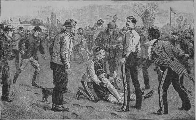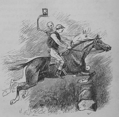 p. 102And then the company, good, bad, and indifferent, had time to remember that a man was down—no, not one man, but two. To find out that Hartog was bruised and stunned, but able with help to get to the dressing-room and recover himself, to learn that the swarming crowd around the other was watching a more exciting race than that which they had just witnessed with shouts and applause, that they were watching with awe and in silence a race between life and death—for Gilchrist, the “odd” man of the regiment, the man who had been nobody’s friend, nobody’s chum, was lying in the midst of them with his back broken, waiting for a hurdle.