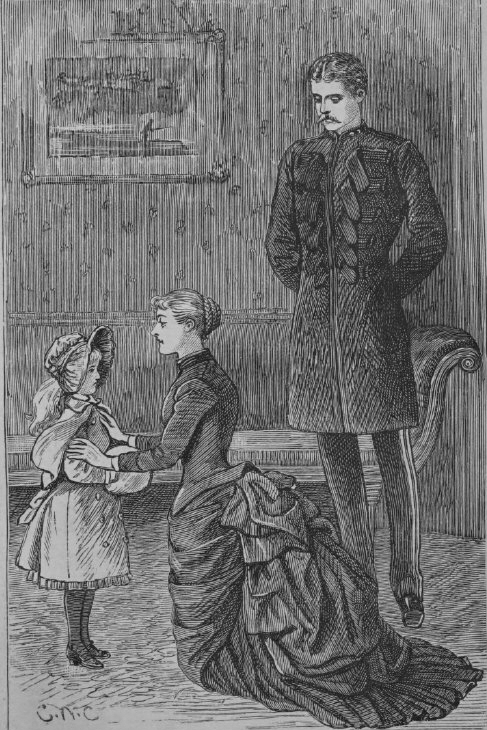 There were all the Scarlet Lancer ladies in full force, from the colonel’s wife in blue velvet and sables, to the quartermaster’s lady in a hard felt hat, with long diamond and pearl ear-rings. There were officers in cords and boots, their silken finery hidden by Newmarket coats. And there was the bride, Mrs. Allardyce, in pink and gray, the major’s racing colors—oh lor! as the fellows said when p. 99they saw her. And there was Miss Mignon, a little three-year-old belle, got up in Bootles’s colors—scarlet, purple, and gold—adapted in her small case to a warm frock of purple velvet, braided with scarlet and gold, and on her golden curls a jockey-cap to match it. Utterly absurd, most people said, but Bootles didn’t seem to see it. Nor, for the matter of that, did Miss Mignon herself. Held by Bootles, or, when Bootles was riding, by Lacy, she sat on the broad ledge of the balcony and surveyed the world, like a queen in miniature.