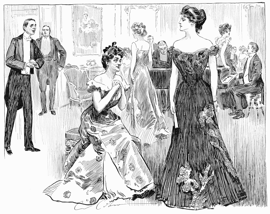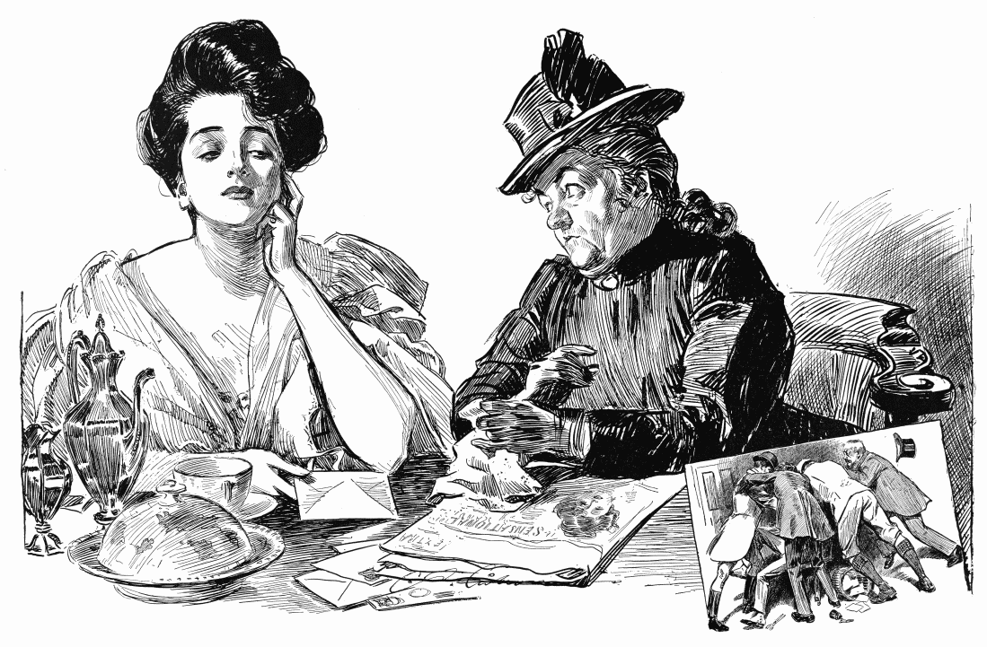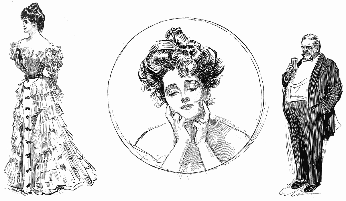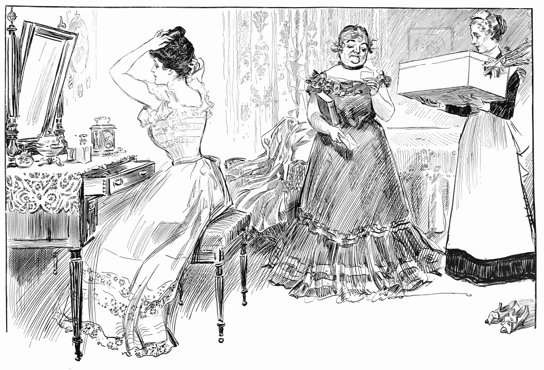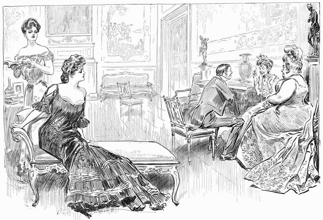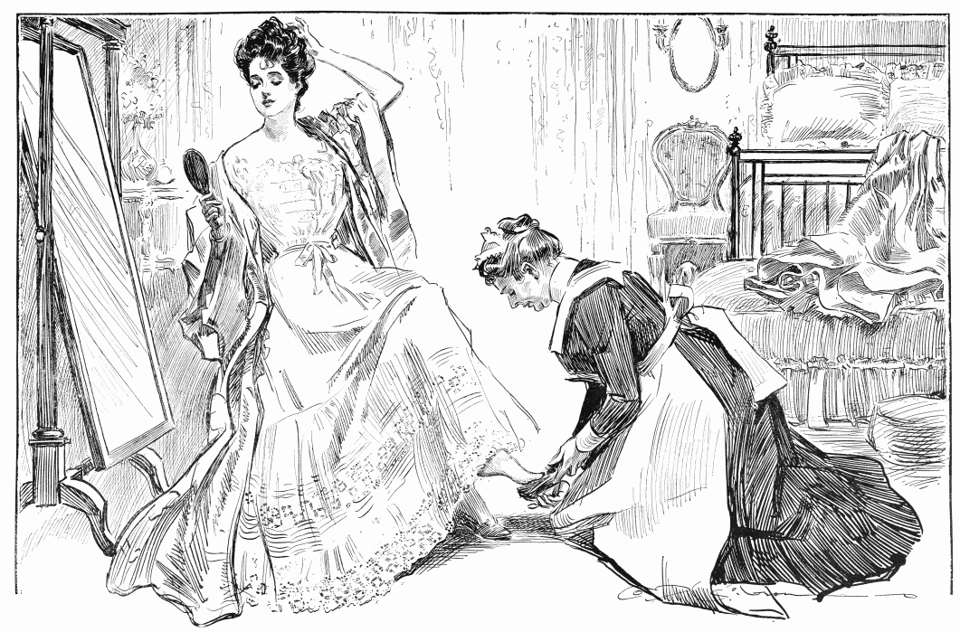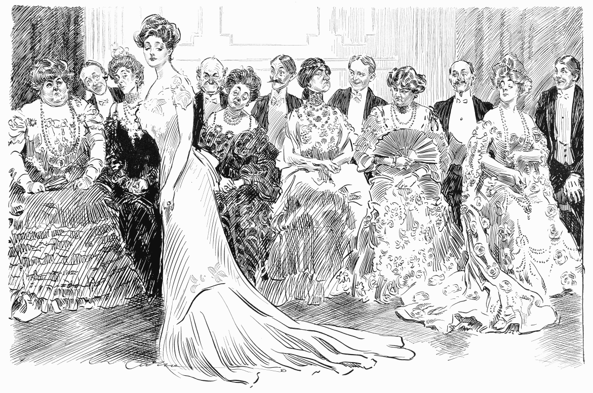 Mrs. Innittor Dedd’s maid reads: “Among those present was Mrs. Innittor Dedd, whose lovely face and splendid figure were enhanced by a tiara of diamonds and three ropes of pearls. She wore her famous rubies and was even more regal than at the Bullyon’s ball the night before,” etc., etc.