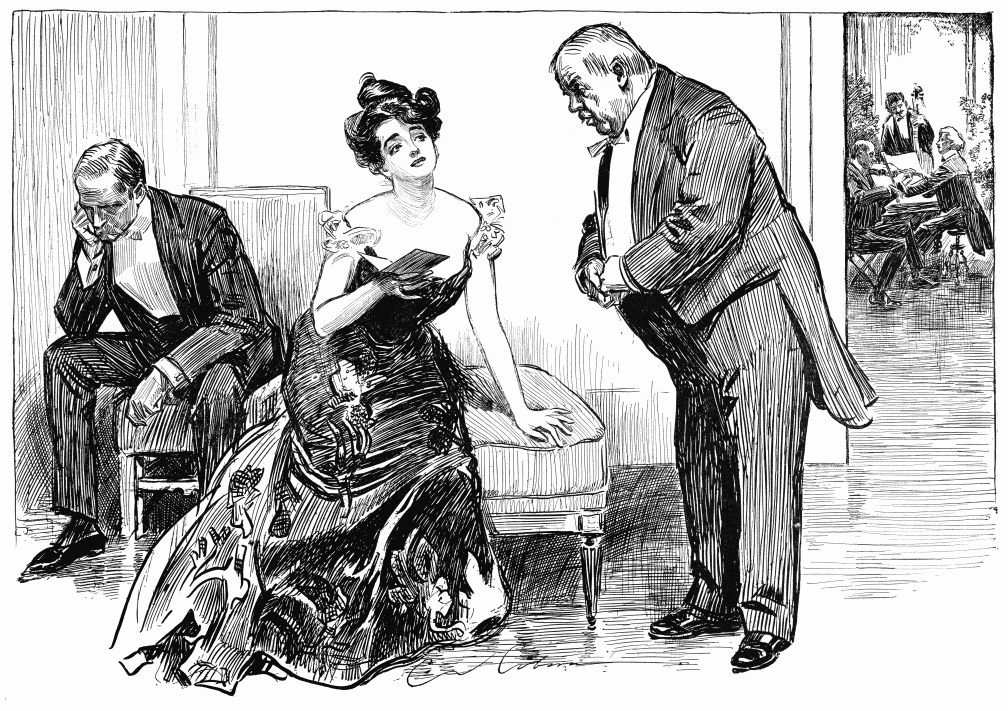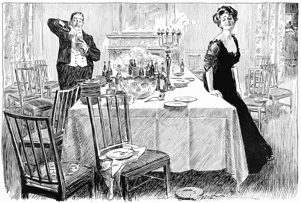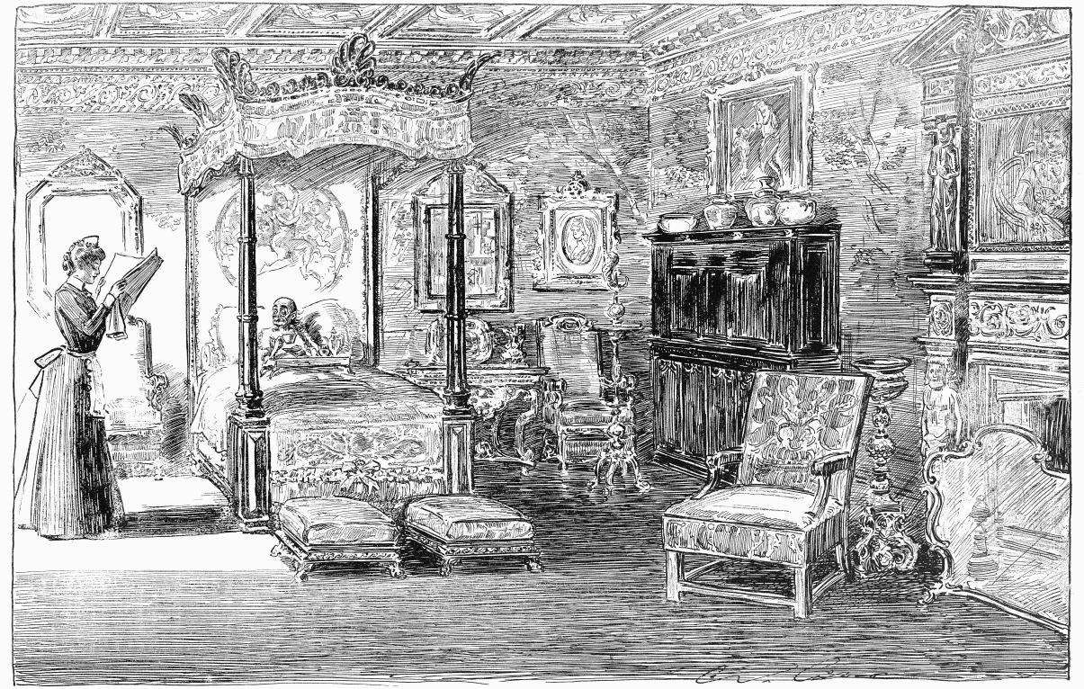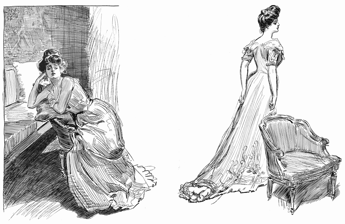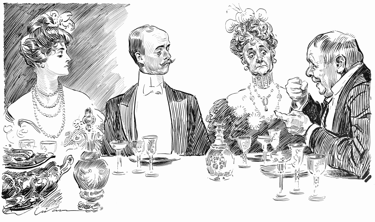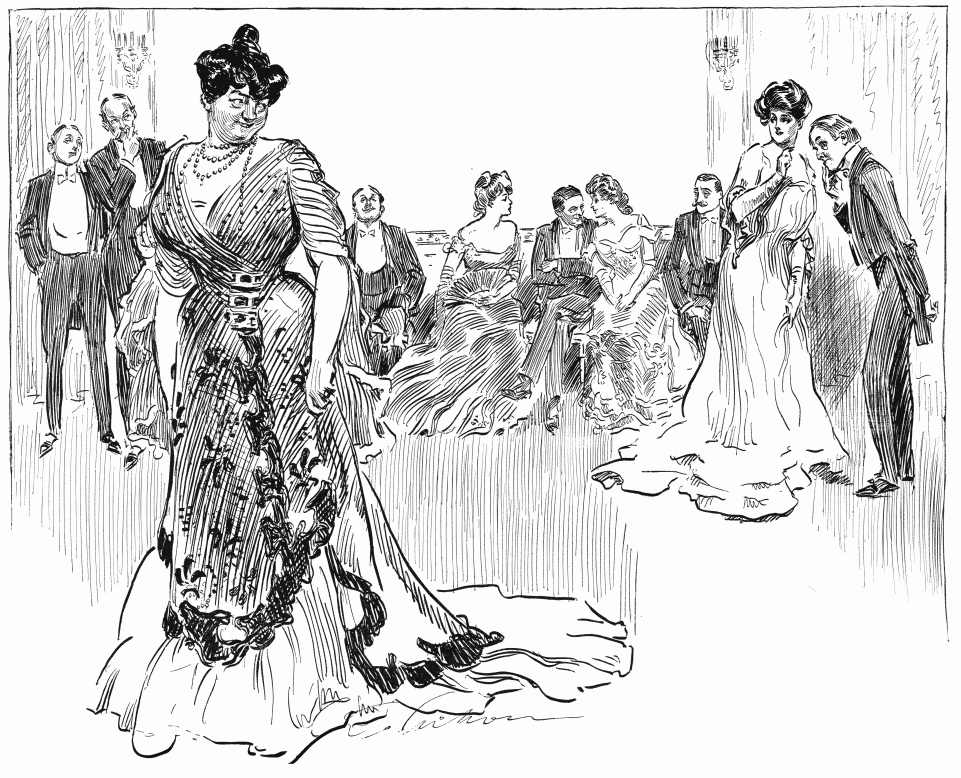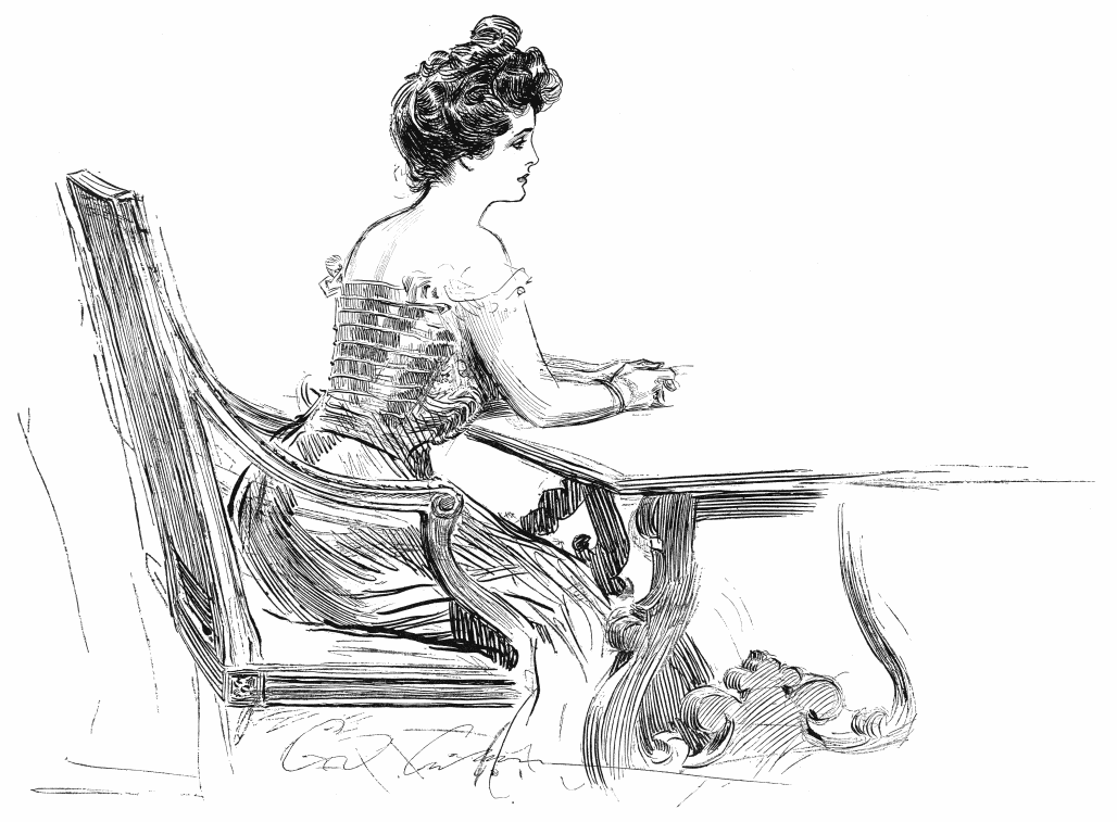Mrs. Innittor Dedd’s maid reads: “Among those present was Mrs. Innittor Dedd, whose lovely face and splendid figure were enhanced by a tiara of diamonds and three ropes of pearls. She wore her famous rubies and was even more regal than at the Bullyon’s ball the night before,” etc., etc.