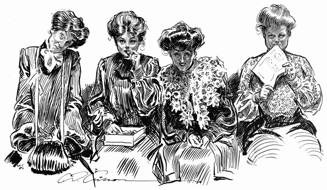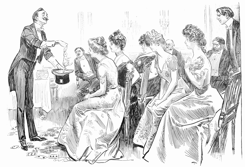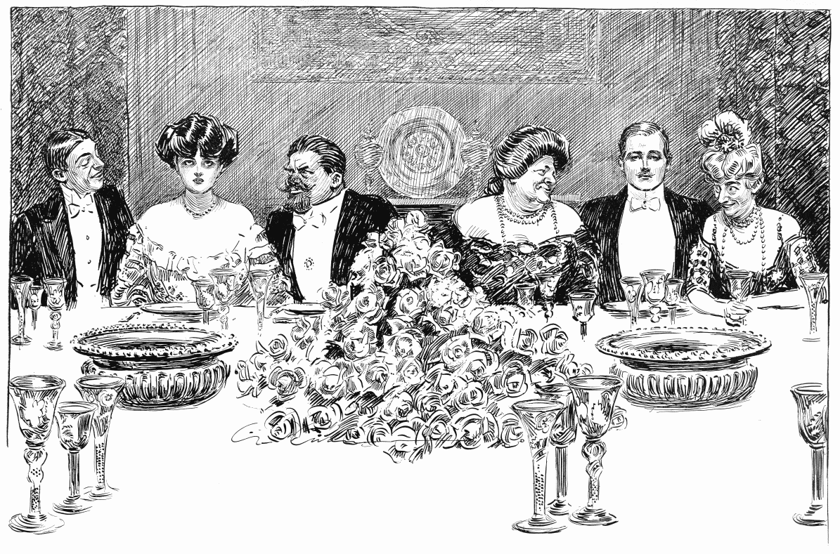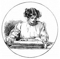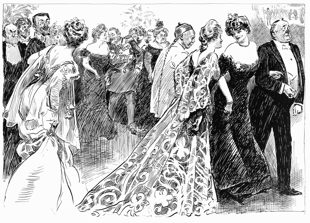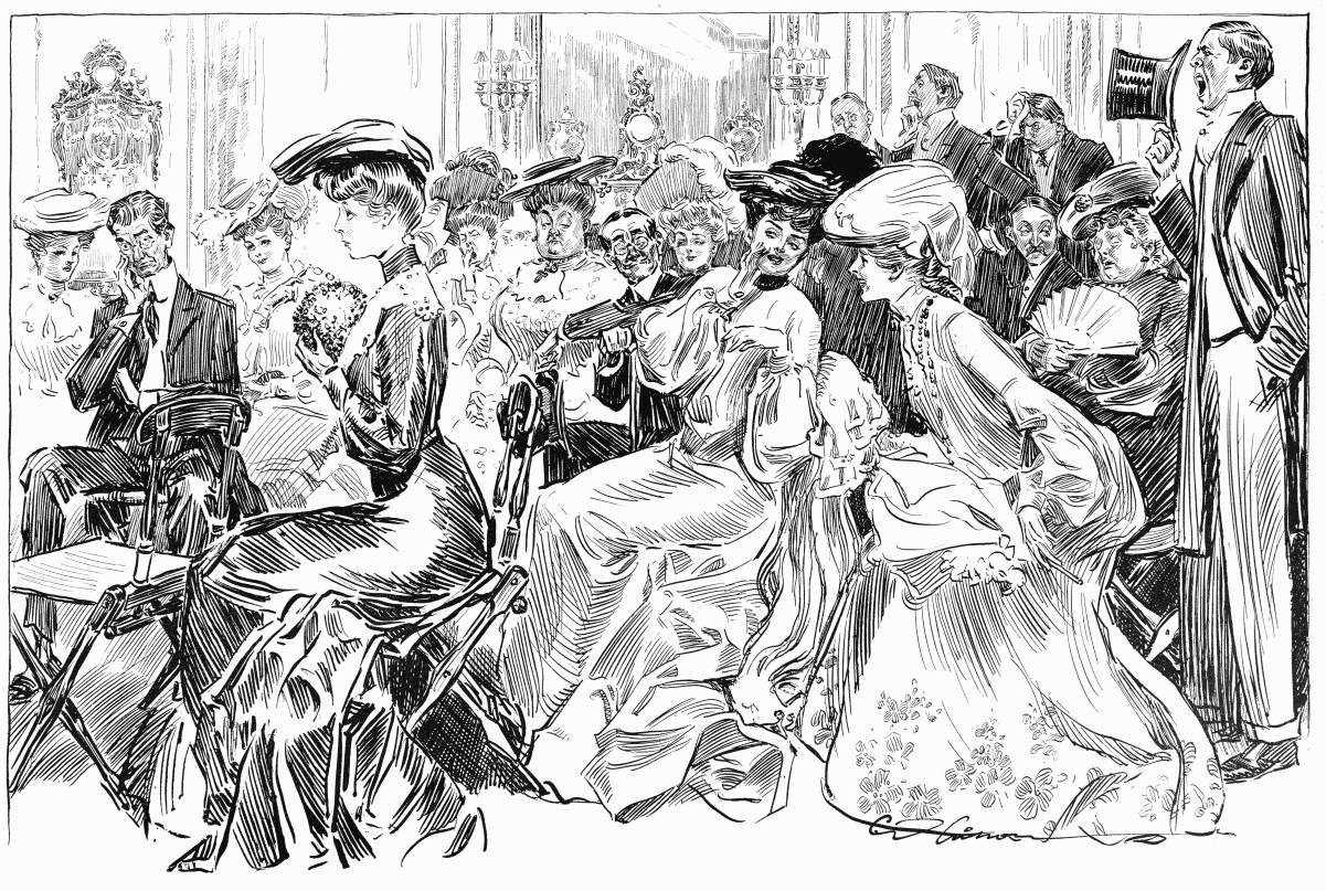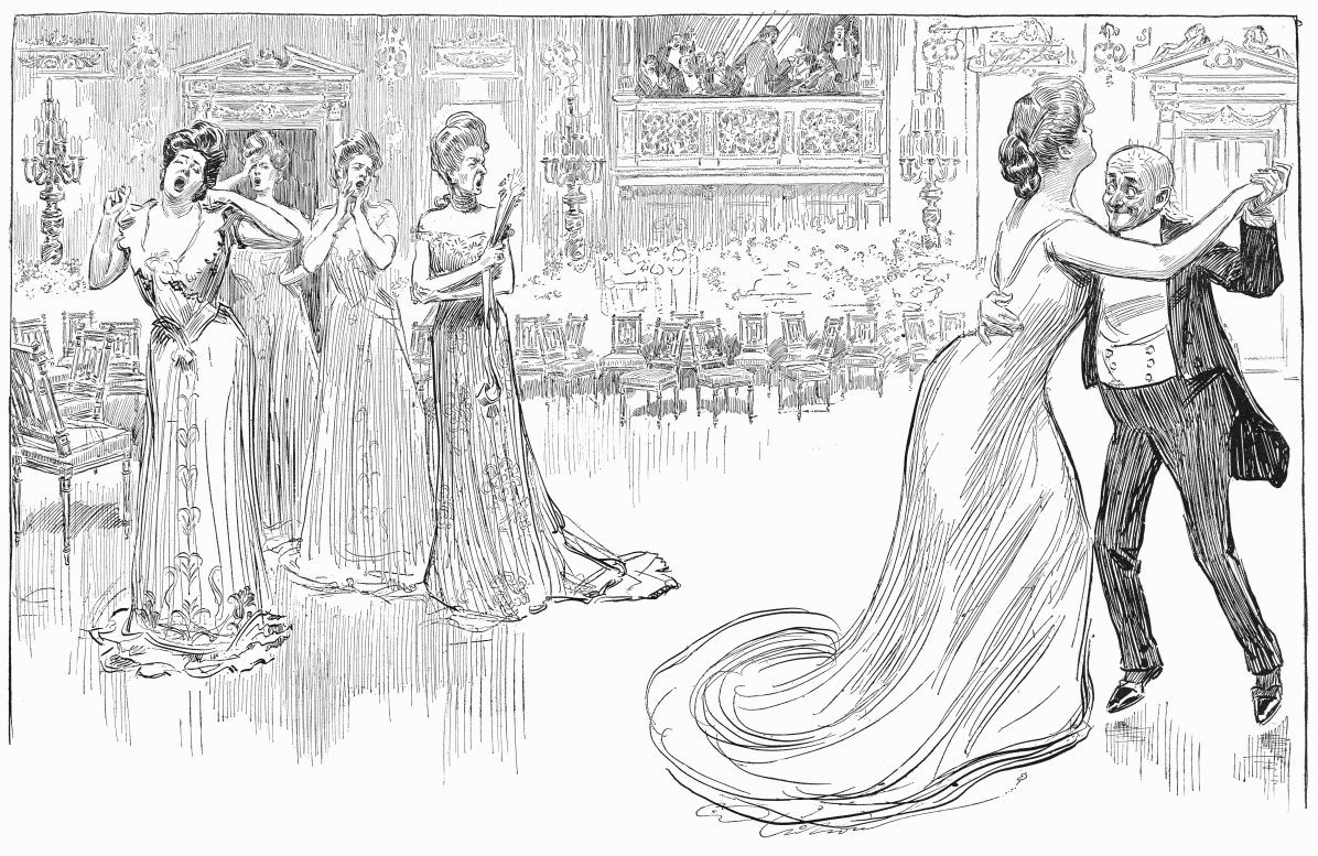 Mrs. Innittor Dedd’s maid reads: “Among those present was Mrs. Innittor Dedd, whose lovely face and splendid figure were enhanced by a tiara of diamonds and three ropes of pearls. She wore her famous rubies and was even more regal than at the Bullyon’s ball the night before,” etc., etc.