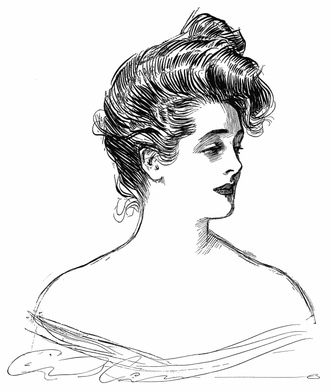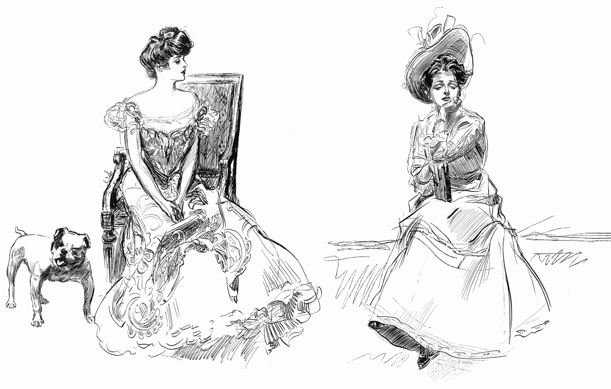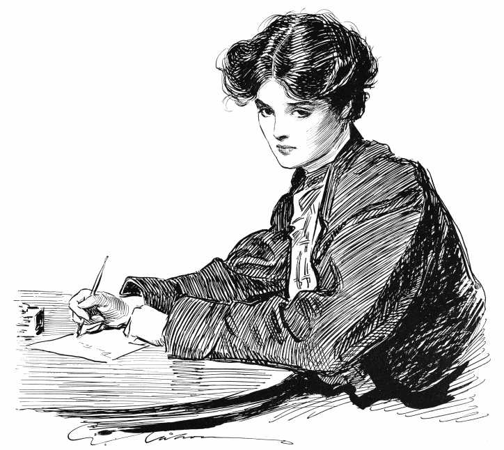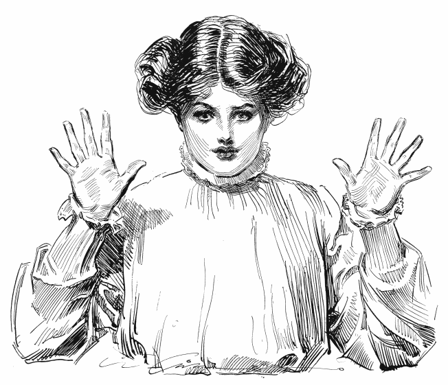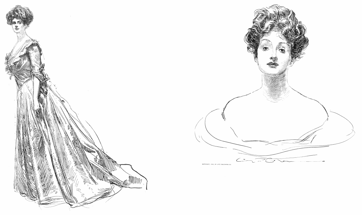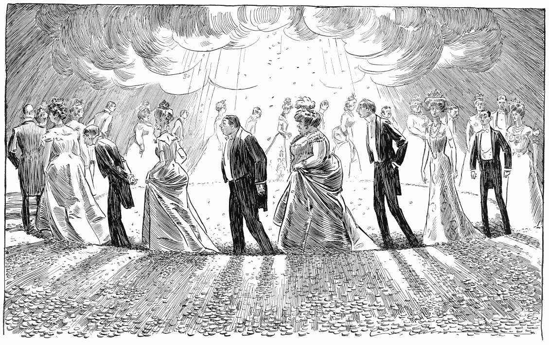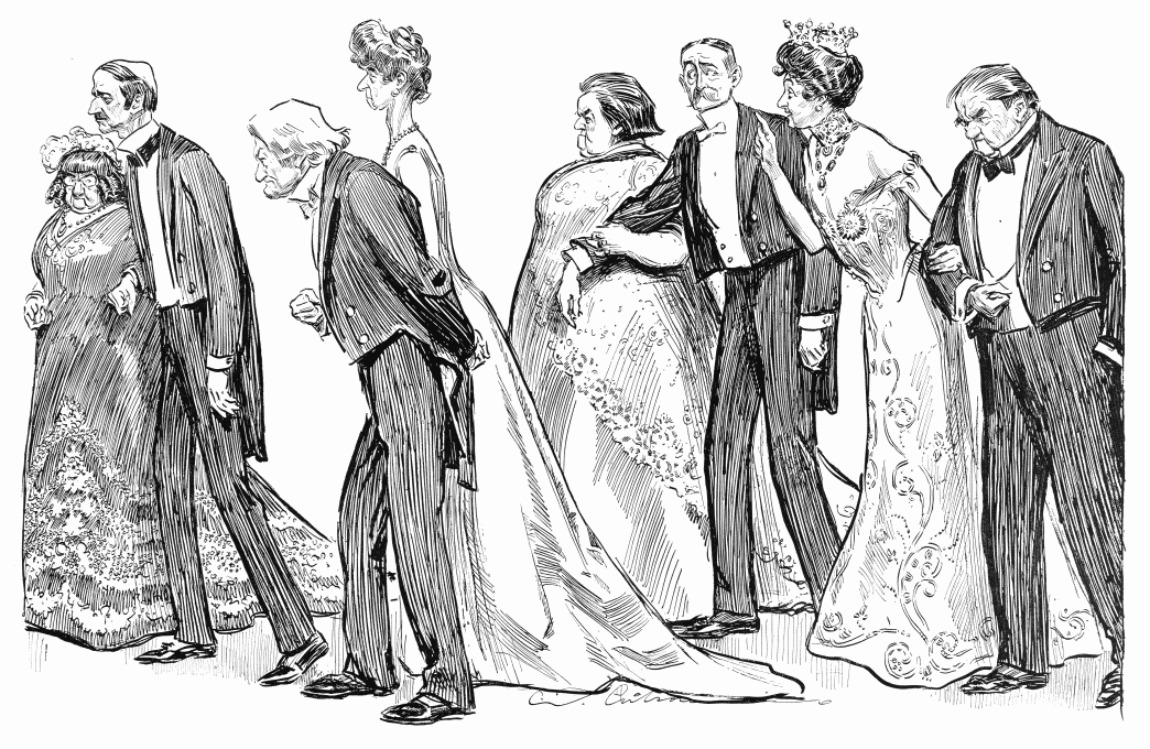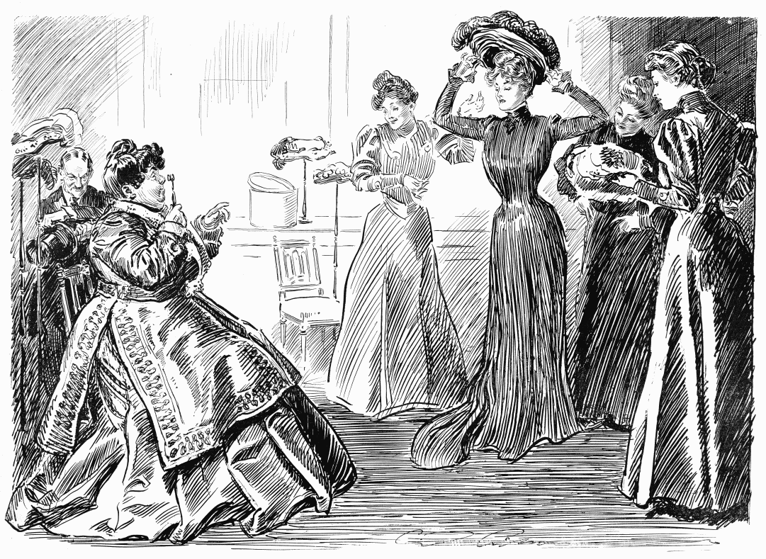 Mrs. Innittor Dedd’s maid reads: “Among those present was Mrs. Innittor Dedd, whose lovely face and splendid figure were enhanced by a tiara of diamonds and three ropes of pearls. She wore her famous rubies and was even more regal than at the Bullyon’s ball the night before,” etc., etc.