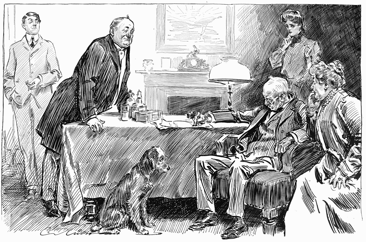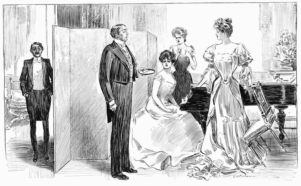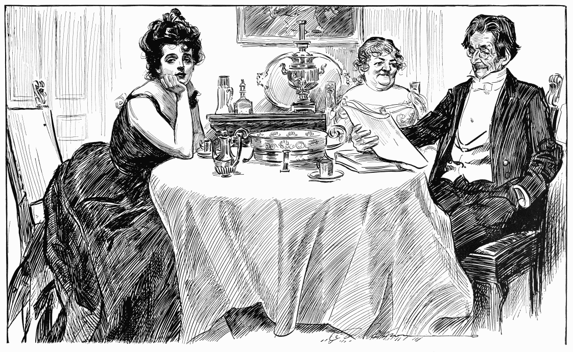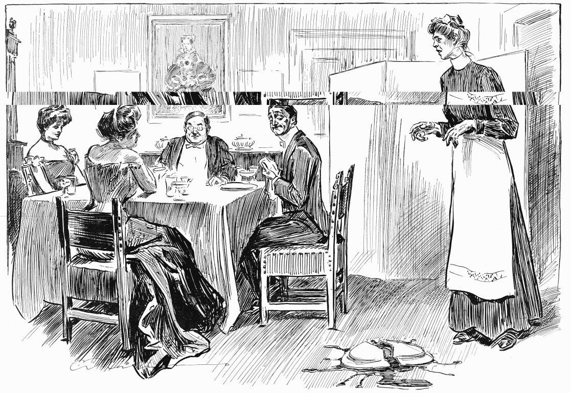 Mr. Meeker, having been kept up late for the last twenty years and rebuked for his lack of interest, develops a sudden enthusiasm. Mrs. Meeker and the girls now do the waiting.