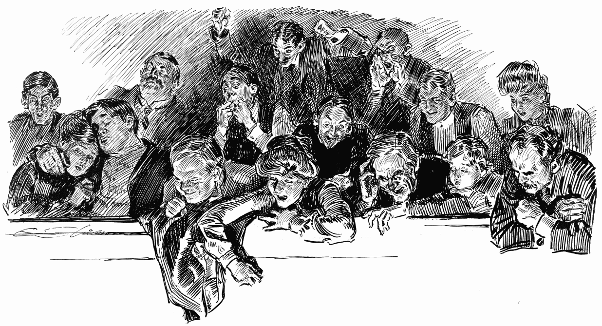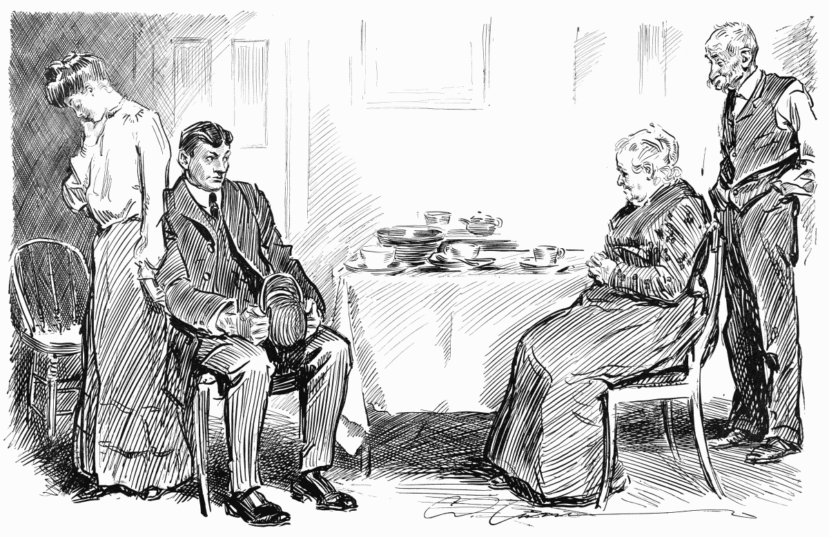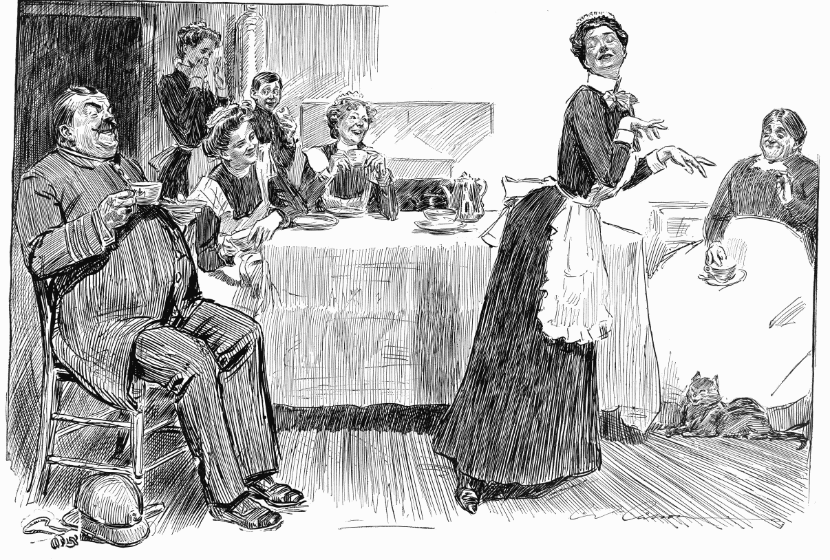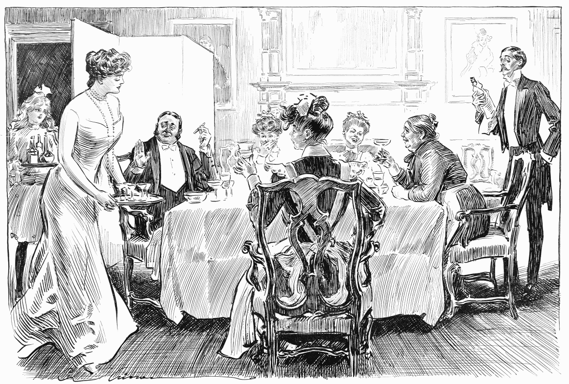 Mr. Meeker, having been kept up late for the last twenty years and rebuked for his lack of interest, develops a sudden enthusiasm. Mrs. Meeker and the girls now do the waiting.