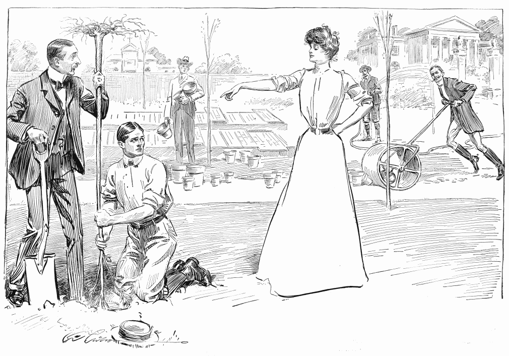 Assisted by his instructor, “Patsy, the Pugg,” he demonstrates to some titled foreigners the fine points of the game.