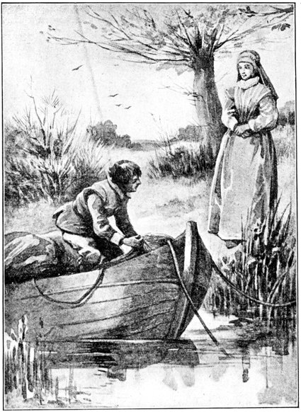 There, at the bottom of the broad steep-sloping bank he soon reached, lay a largish boat tied by a rope to the stem of an elm-tree.{26} Charles’s heart leapt within him: that was just the thing he wanted. Surely some kind woodland fairy must have placed it there, as fairies do in story-books, for his convenience. The next minute his delight faded out: another glance showed that the craft was loaded rather heavily for its size with some wicker-baskets and a small cask and a sack which peeped out from beneath a big canvas covering, and of course to get in and row off, with all that cargo aboard, would make him like a thief, so the plan was impossible. While he was cogitating on this most difficult question he heard voices, and voices that he knew well, too. No less than those of Lady Chauncy and Wynkin, who seemed to be coming through the trees. Charles turned all gooseflesh with dismay. To make a run for it would, likely as not, land him right into her ladyship’s stiff brocade skirts. There was not a minute to think, and so he ran the other way down the bank faster than a rabbit, and hey presto! with one leap he was at the bottom of the boat, and, creeping under the canvas among the sacks.