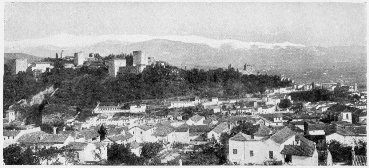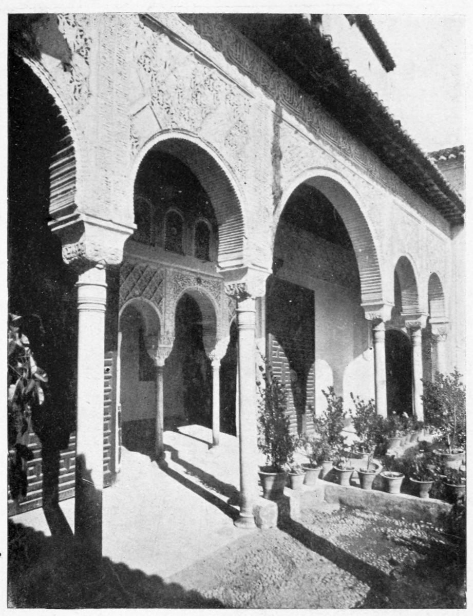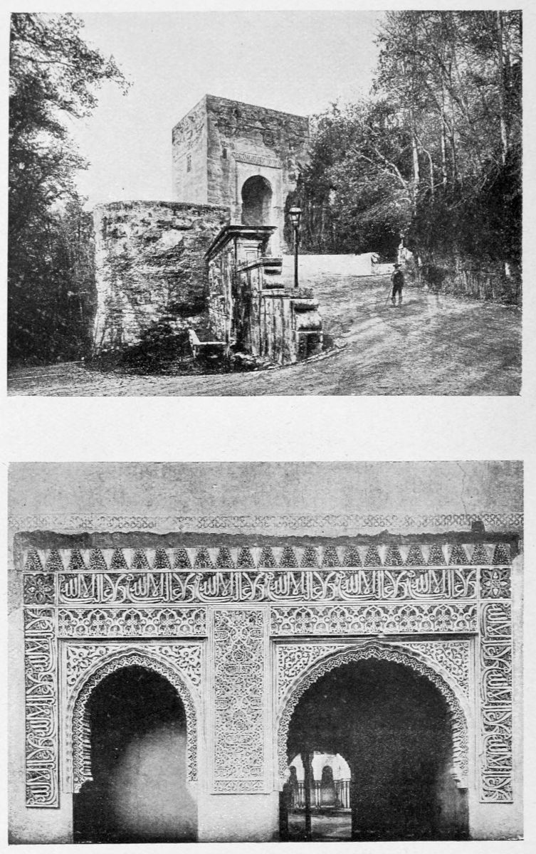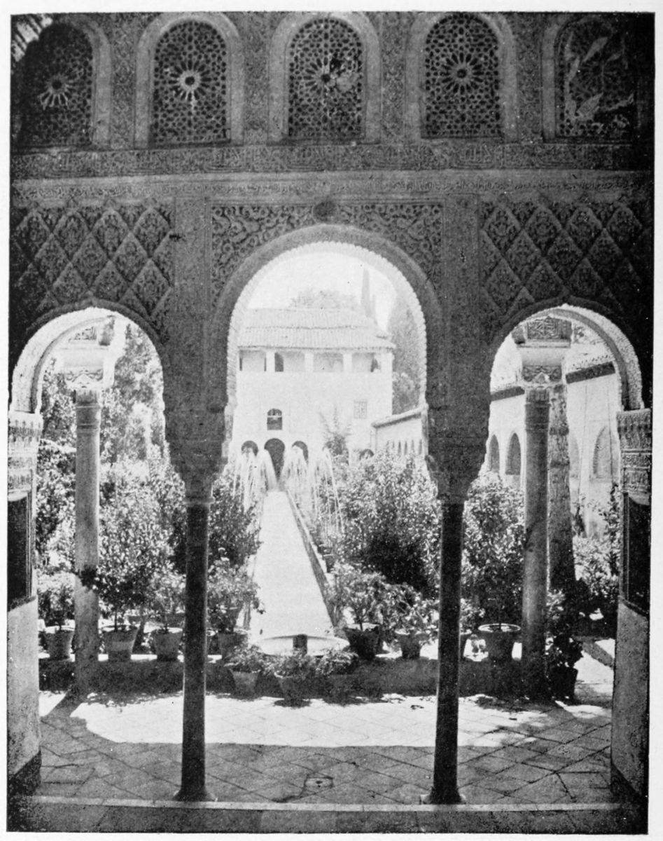For the historical portions of the description contained in the letterpress I have levied tribute on a variety of authors. The History of the Mohammedan Dynasties in Spain, by the learned Spanish Orientalist, Don Pascual de Gayángos; Raphaël Contreras’ Étude Descriptive des Monuments Arabes; Richard Ford’s reverent appreciations; Dr. R. Dozy’s history; Mr. Stanley Lane-Poole’s The Moors in Spain; Washington Irving’s fascinating writings; and The Alhambra Album, presented by Prince Dolgorouki in 1829, containing the autographs, poems, and thoughts of succeeding generations of visitors to Granada, these and many others have been drawn upon in the following pages.