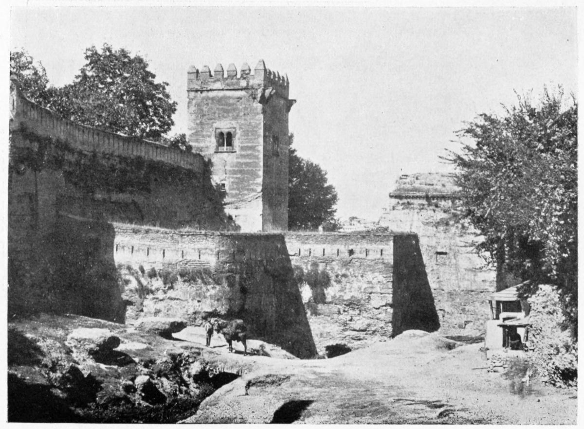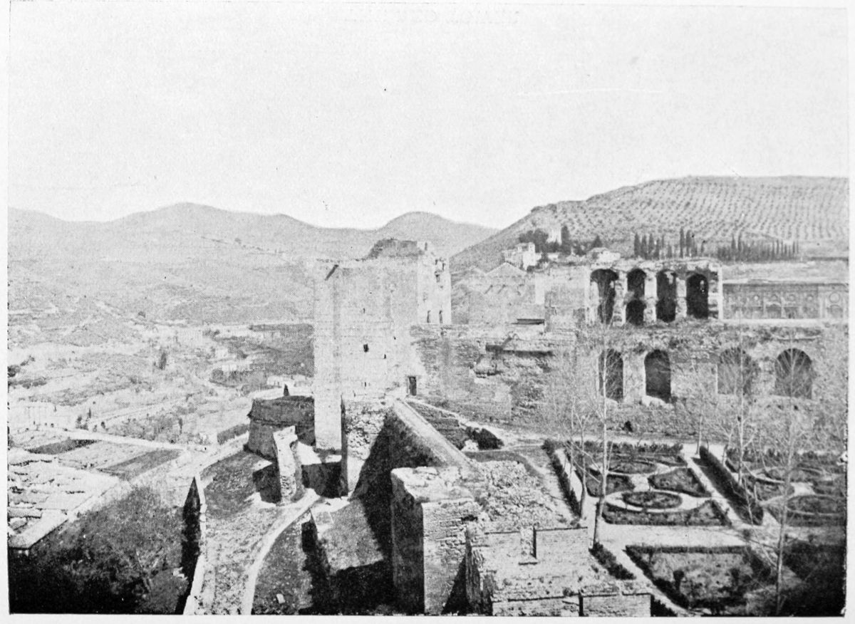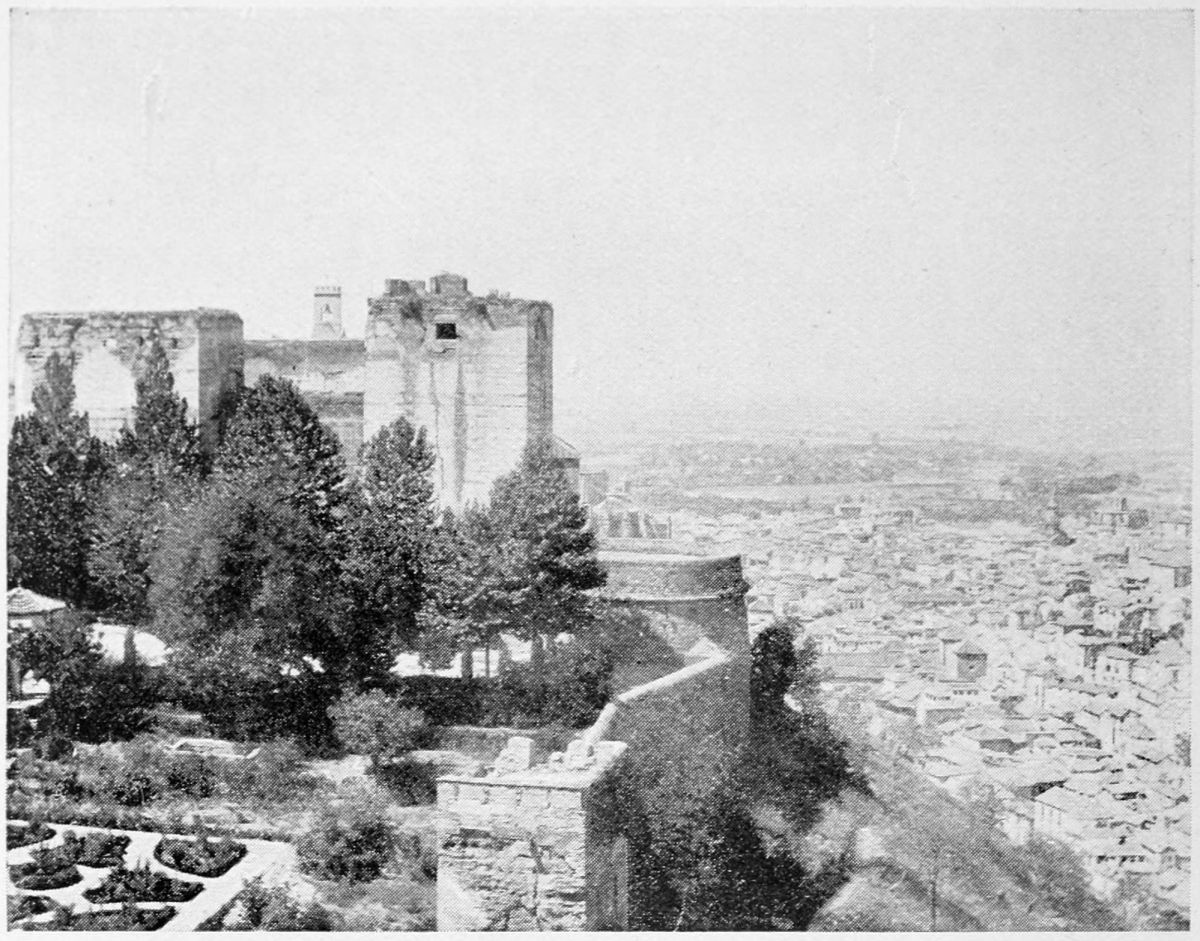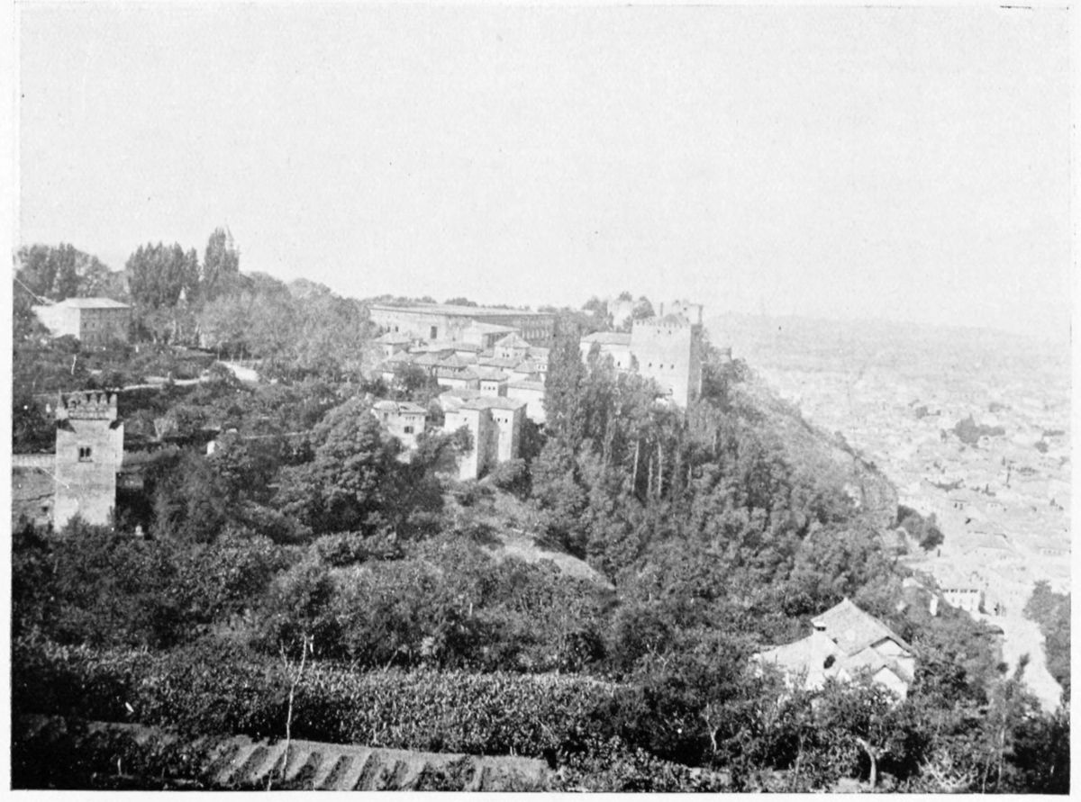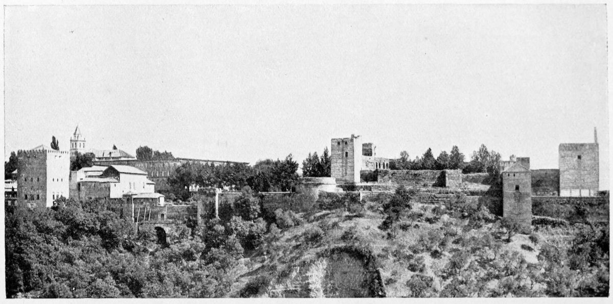 The Sierra Nevada thrusts forward a spur which overlooks Granada on the south-east, and is divided by two clefts or barrancos into three eminences. The easternmost of these is crowned by the Generalife, the westernmost by the ancient fortifications known as the Torres Bermejas or Vermilion Towers. The hill between the two—in shape aptly compared by Ford to a grand{27} piano—is that on which the various buildings, collectively styled the Alhambra, are reared. Here there existed a settlement in remote Celtiberian days; and the later city of Illiberis or Elvira stood here, and perhaps extended to the Torres Bermejas. When the Moors came they erected a fortress—the Alcazaba—on the point of the Alhambra hill, overlooking the Vermilion Towers. To this they gave the name of Alhamra, “the red,” as Riaño thinks, to distinguish it from the Alcazaba in the Albaicin quarter, or perhaps from some confusion of the new building with the old. The builder, according to Al Khattíb, was one Sawar Alcaysi, who lived in the second half of the ninth century; though Contreras says it was known as the Tower of Ibn Jaffir, and Ford names Habus Ibn Makesen as the founder. At all events, the structure dated from the earliest period of the Arabic domination, and Al Ahmar found here, on taking possession of Granada, a small town girdled with walls and defended by a citadel.