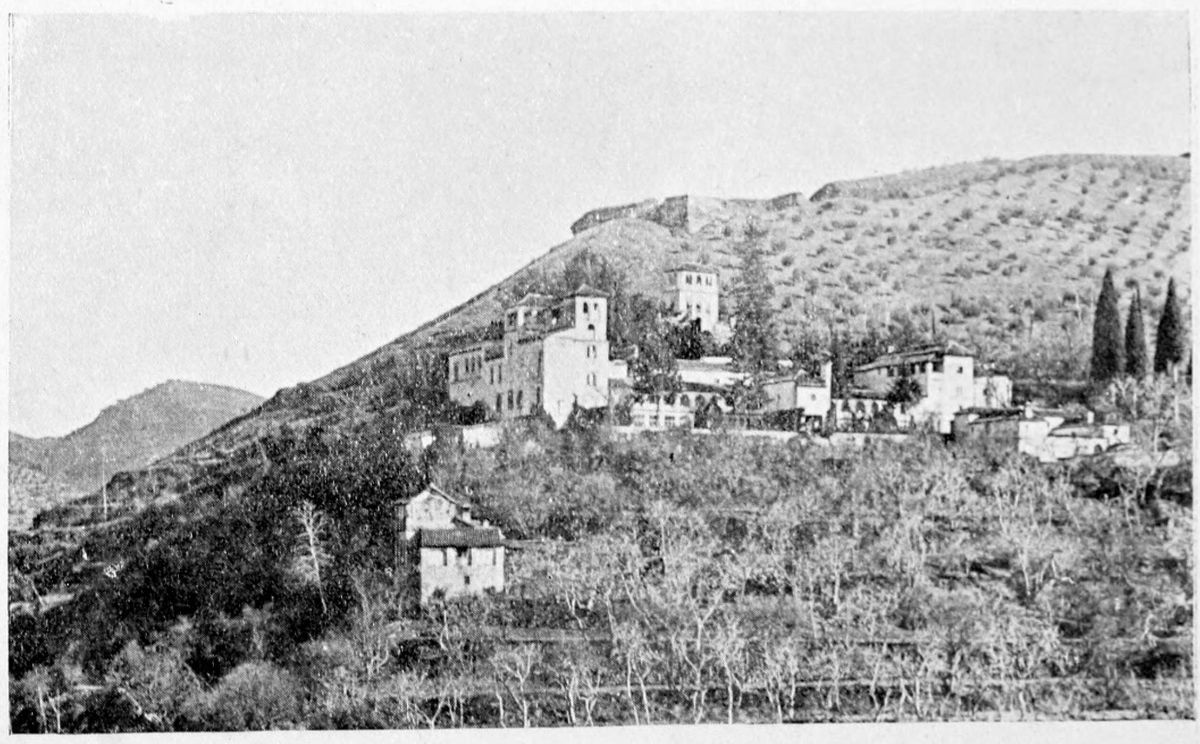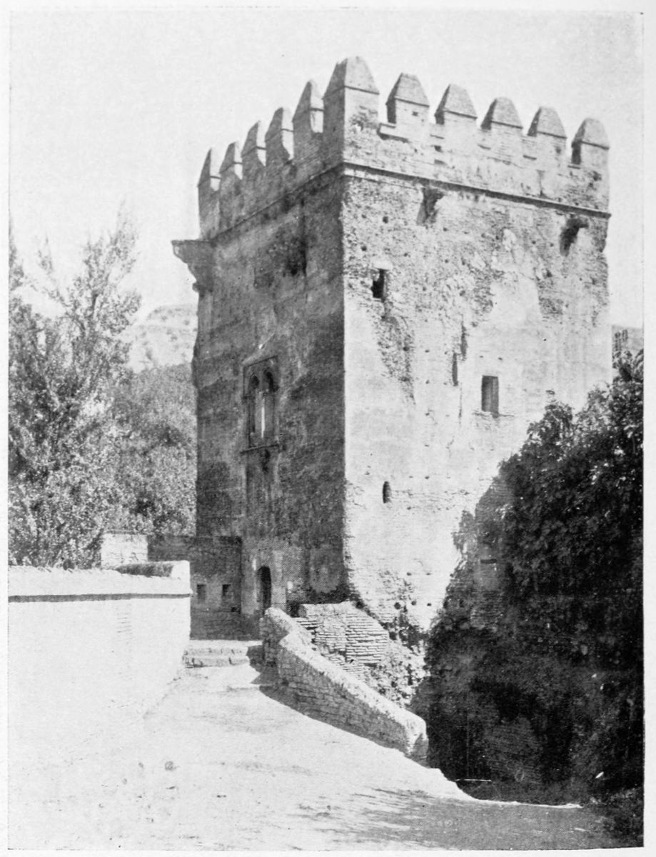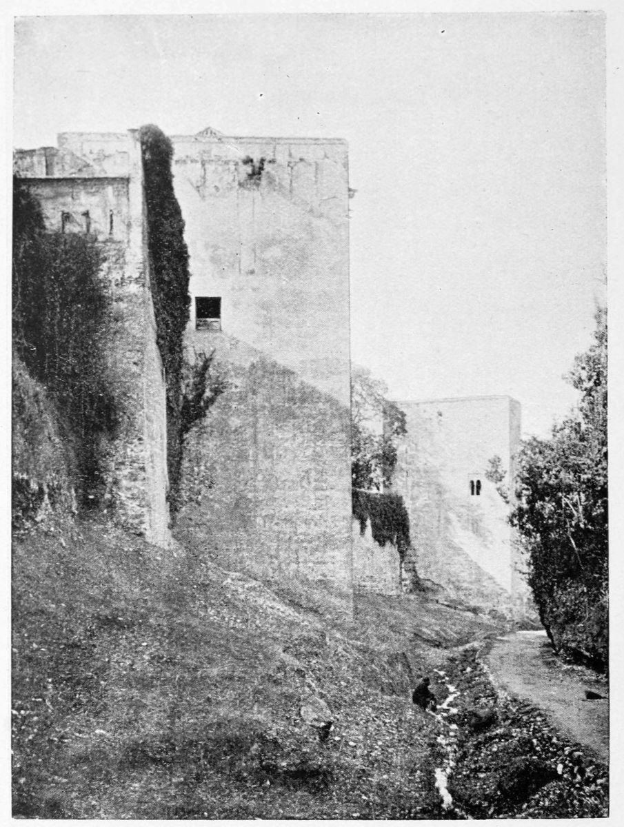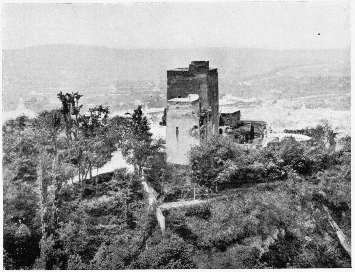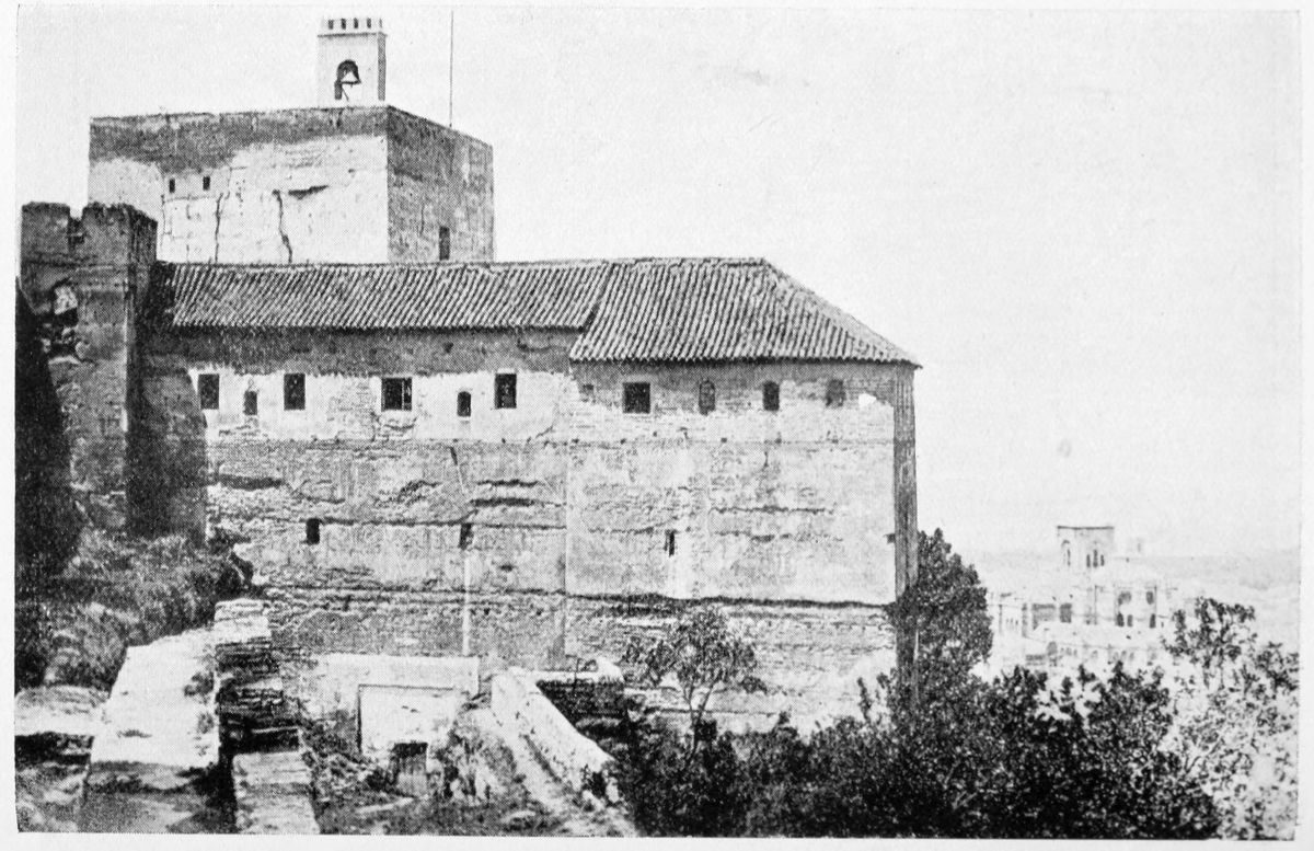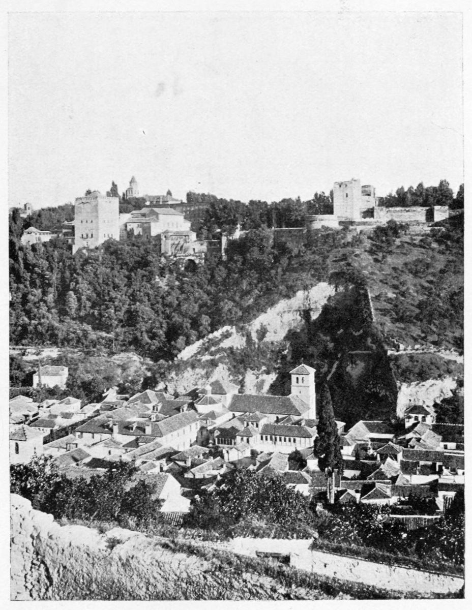 The Sierra Nevada thrusts forward a spur which overlooks Granada on the south-east, and is divided by two clefts or barrancos into three eminences. The easternmost of these is crowned by the Generalife, the westernmost by the ancient fortifications known as the Torres Bermejas or Vermilion Towers. The hill between the two—in shape aptly compared by Ford to a grand{27} piano—is that on which the various buildings, collectively styled the Alhambra, are reared. Here there existed a settlement in remote Celtiberian days; and the later city of Illiberis or Elvira stood here, and perhaps extended to the Torres Bermejas. When the Moors came they erected a fortress—the Alcazaba—on the point of the Alhambra hill, overlooking the Vermilion Towers. To this they gave the name of Alhamra, “the red,” as Riaño thinks, to distinguish it from the Alcazaba in the Albaicin quarter, or perhaps from some confusion of the new building with the old. The builder, according to Al Khattíb, was one Sawar Alcaysi, who lived in the second half of the ninth century; though Contreras says it was known as the Tower of Ibn Jaffir, and Ford names Habus Ibn Makesen as the founder. At all events, the structure dated from the earliest period of the Arabic domination, and Al Ahmar found here, on taking possession of Granada, a small town girdled with walls and defended by a citadel.