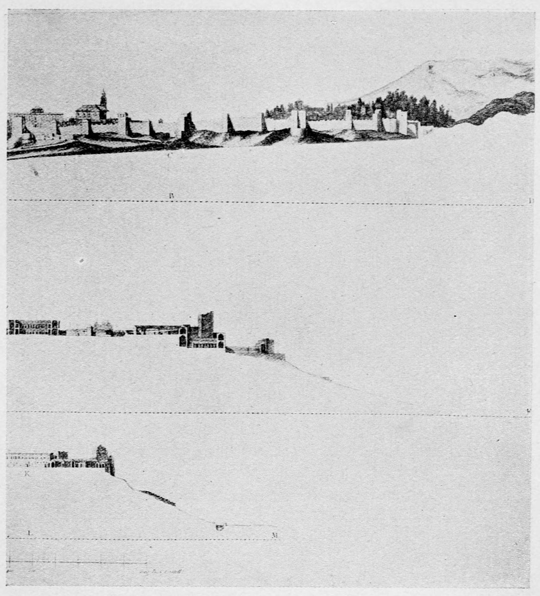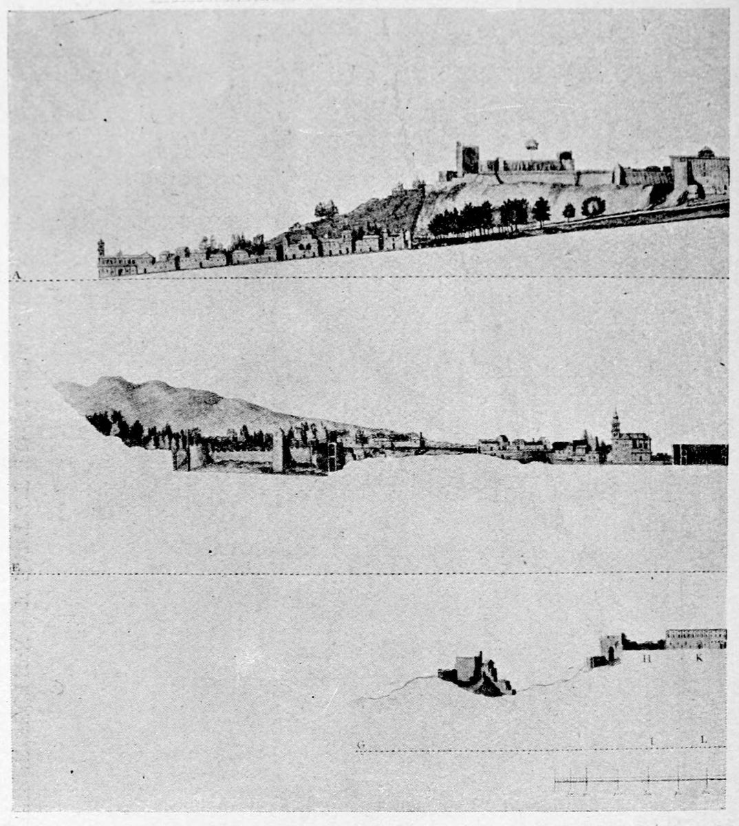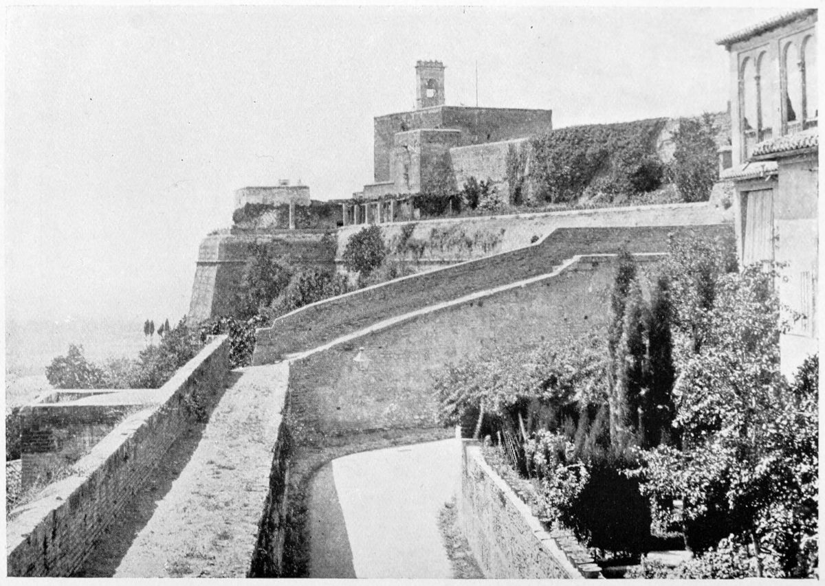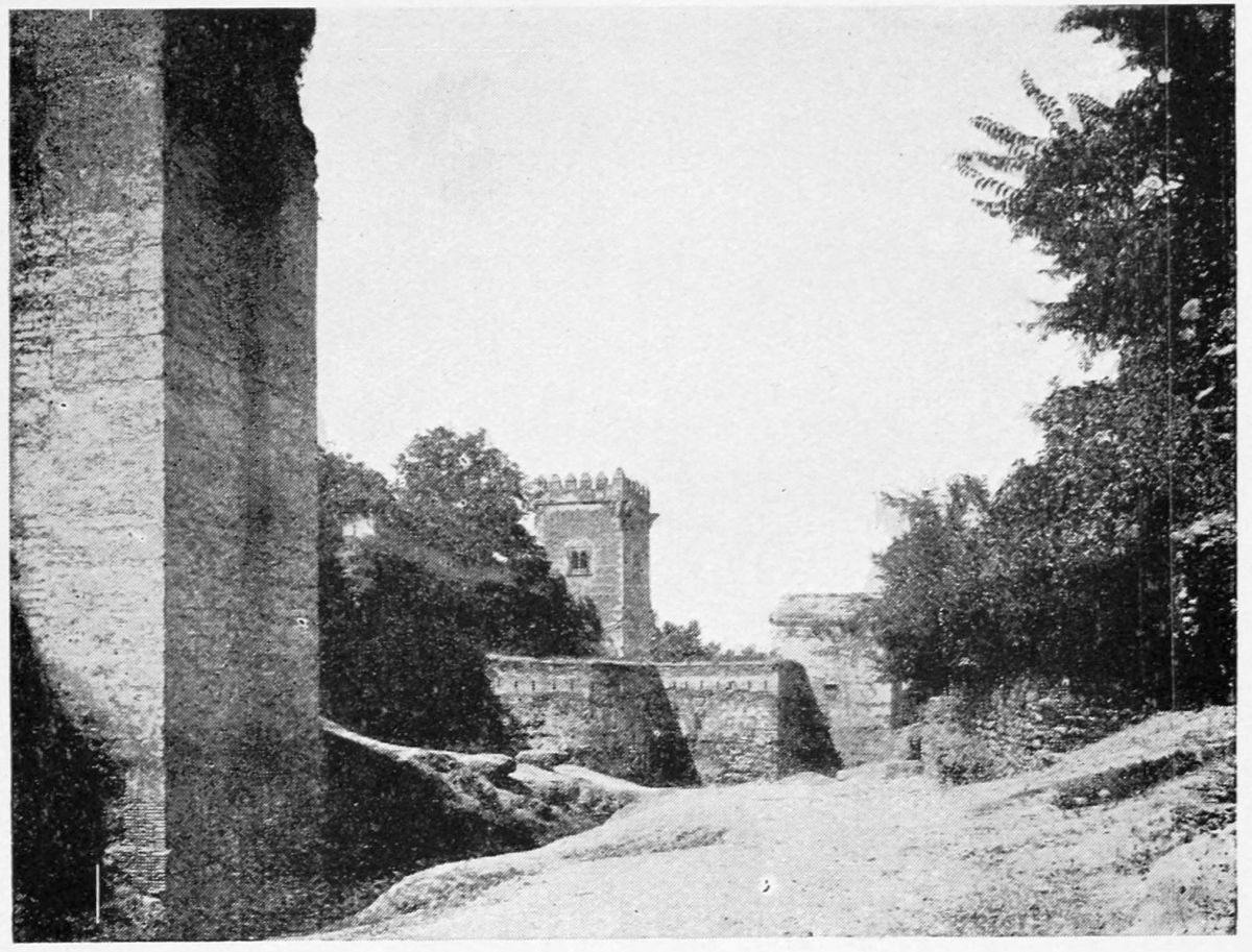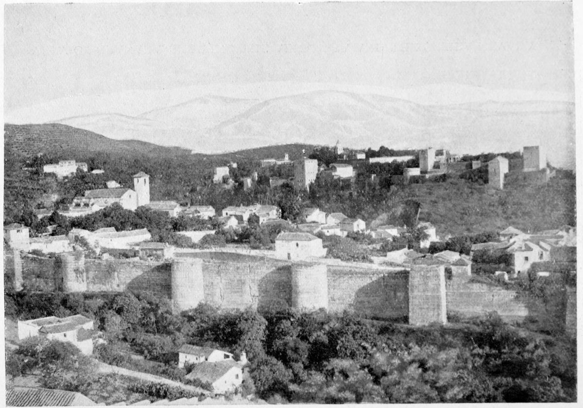 The Sierra Nevada thrusts forward a spur which overlooks Granada on the south-east, and is divided by two clefts or barrancos into three eminences. The easternmost of these is crowned by the Generalife, the westernmost by the ancient fortifications known as the Torres Bermejas or Vermilion Towers. The hill between the two—in shape aptly compared by Ford to a grand{27} piano—is that on which the various buildings, collectively styled the Alhambra, are reared. Here there existed a settlement in remote Celtiberian days; and the later city of Illiberis or Elvira stood here, and perhaps extended to the Torres Bermejas. When the Moors came they erected a fortress—the Alcazaba—on the point of the Alhambra hill, overlooking the Vermilion Towers. To this they gave the name of Alhamra, “the red,” as Riaño thinks, to distinguish it from the Alcazaba in the Albaicin quarter, or perhaps from some confusion of the new building with the old. The builder, according to Al Khattíb, was one Sawar Alcaysi, who lived in the second half of the ninth century; though Contreras says it was known as the Tower of Ibn Jaffir, and Ford names Habus Ibn Makesen as the founder. At all events, the structure dated from the earliest period of the Arabic domination, and Al Ahmar found here, on taking possession of Granada, a small town girdled with walls and defended by a citadel.