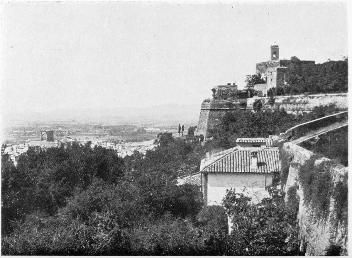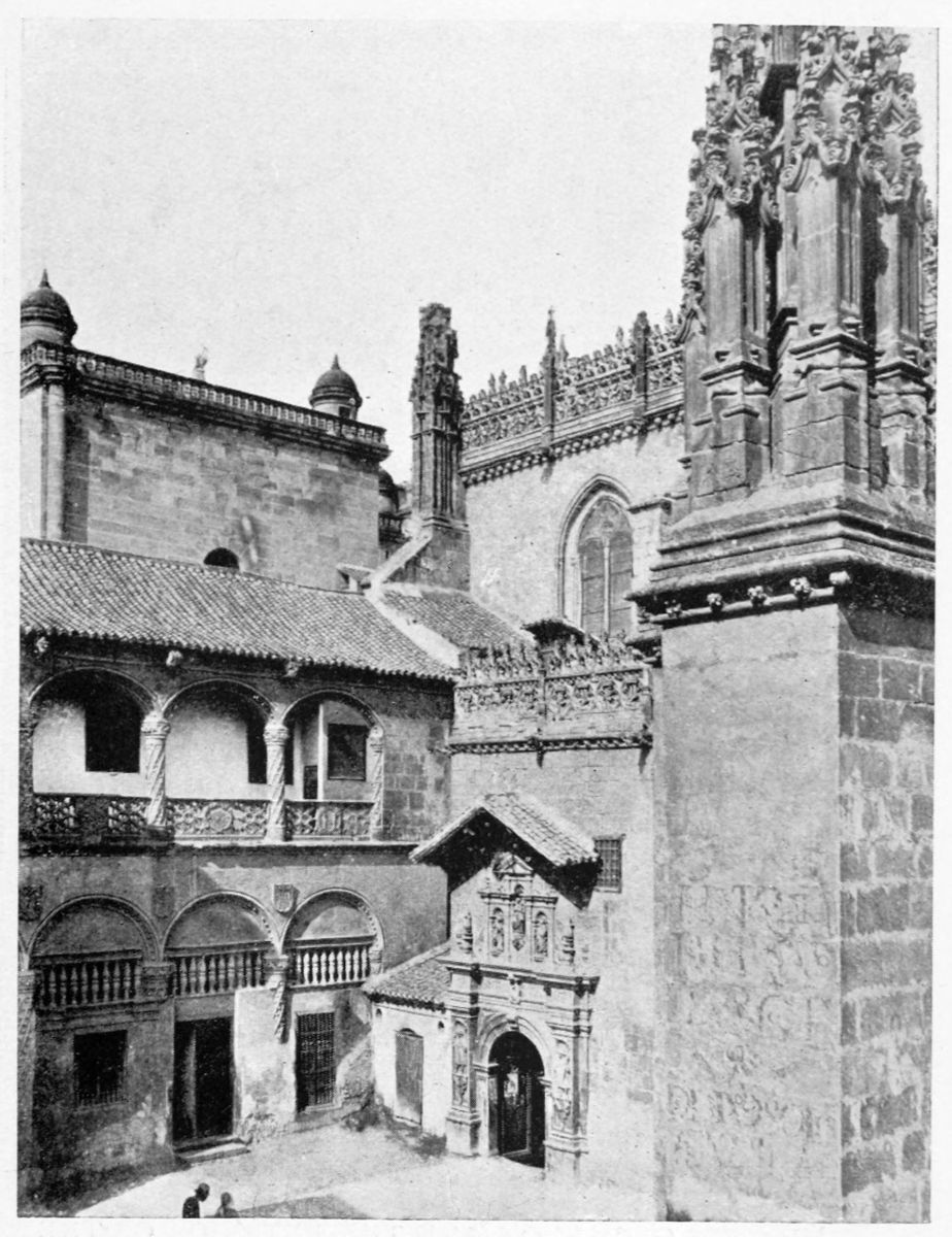The Alcazaba, being the oldest part of the palace-fortress, should be studied first. It is entered by the Torre and Casa de las Armas, through a horseshoe arch in red brick, with fine azulejos or glazed tiles. To the left is the Torre de Homenage, with which war and time have not dealt too gently. It contains, it is interesting to note, a Roman votive altar, embedded by the Moorish builders in the masonry, and inscribed by “the grateful Valerius to his most indulgent wife, Cornelia.” At the opposite extremity of the Alcazaba is the Torre de la Vela, or Watch Tower. It is in two storeys, communicating by a dark and narrow staircase, with loopholes{29} in the wall.[D] In this tower is hung a famous bell, to be heard, it is said, at Loja, thirty miles away. It is rung on the anniversary of the Conquest of Granada, on which day it is the custom, according to local superstition, for damsels, desirous of husbands, to strike it with all their strength. On the summit of this tower the cross was first planted by el tercer rey, Cardinal Mendoza. The view from the platform, of city and snow-clad Sierra, luxuriant Vega, and white-walled towns and villages, is as extensive as it is beautiful. At the foot of the Torre de la Vela extends the place of arms, defended by two towers, now styled de los Hidalgos and de la Polvora, and formerly known as the Paniagua and Cristóbal del Salto—names suggesting legends now forgotten.