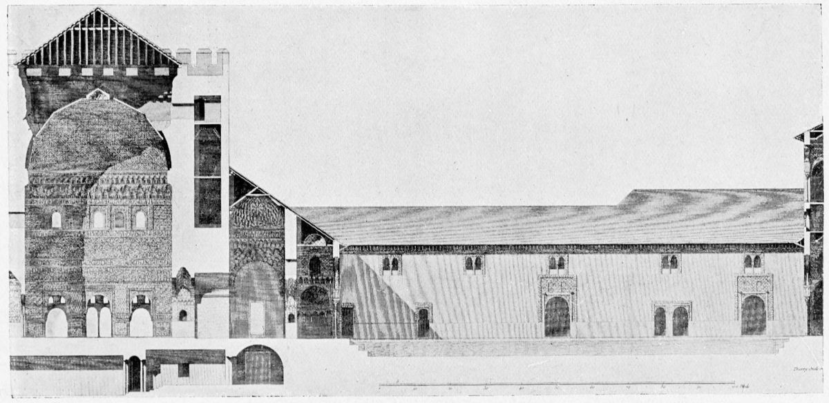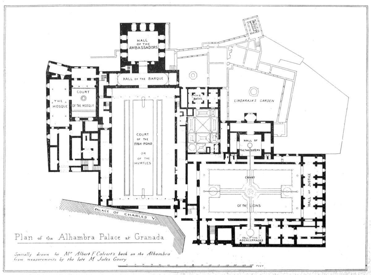 “Outside this plan, absolutely classical, which we may compare to a cross with the transverse arm prolonged and cut at various distances by perpendicular arms parallel to each other, but of different length, the Spanish Arabs found no other easy method of building, so that, while diminishing or prolonging the arms of the axis as much as the dependencies of the largest palaces might require, they never departed from the system, wherever they might build.... This, then, is the true scheme of the Alhambra, and it is quite other than that conceived by the classicists of the eighteenth century, with its façades, angles, and squares.”
